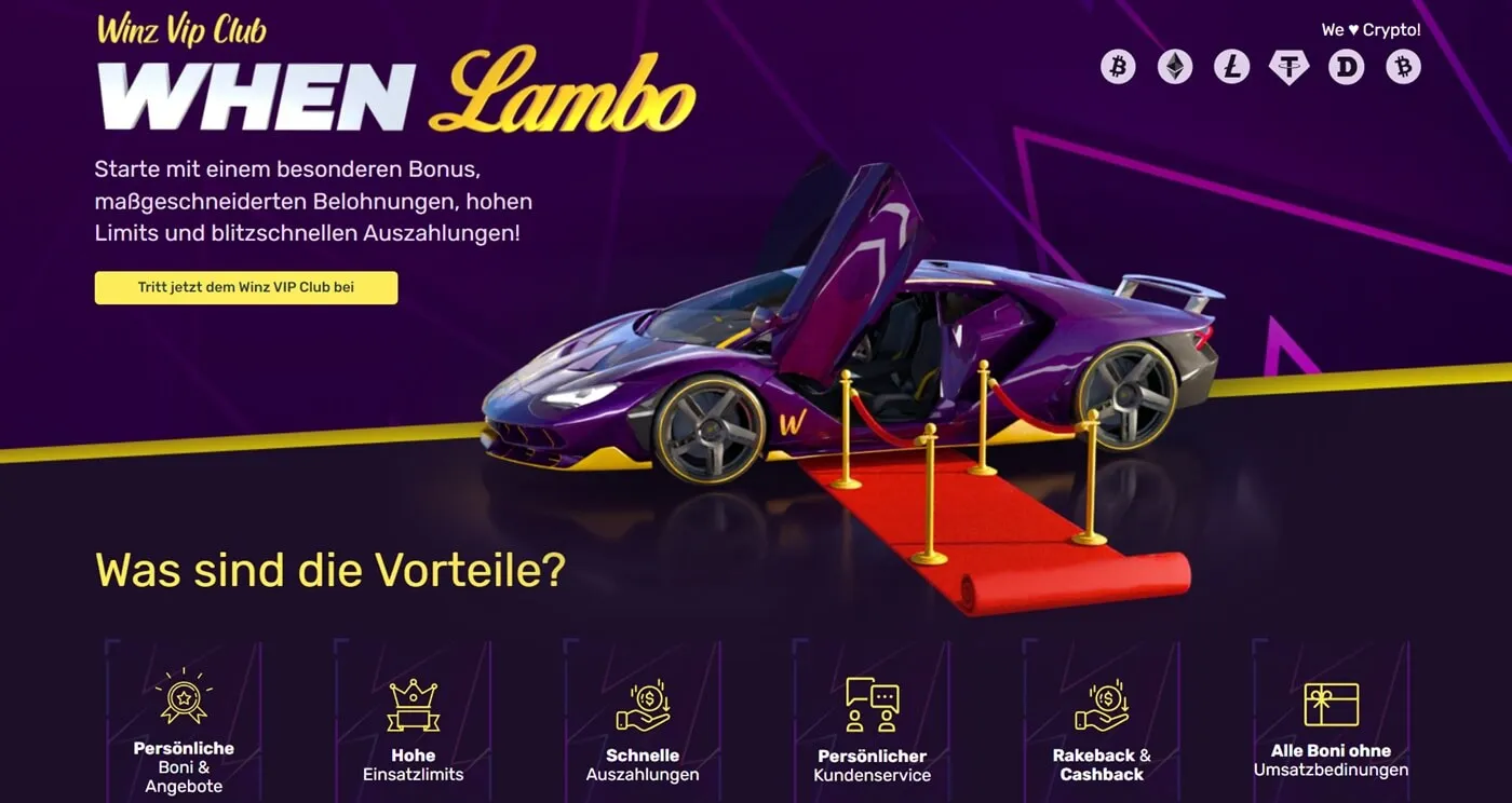 Winz akzeptiert mehrere Fiat-Währungen, darunter Euro und Dollar. Aber wir müssen sagen, dass Winz.io sich auf das Glücksspiel mit Kryptowährungen konzentriert.