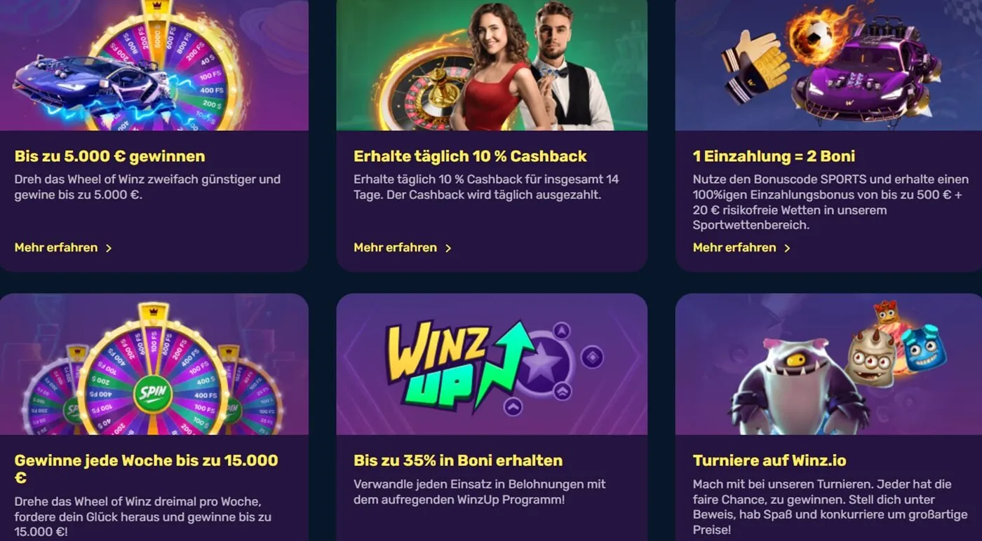 Wenn Sie den Geist des Wettbewerbs zu schätzen wissen, gibt es auch gute Nachrichten. Winz veranstaltet regelmäßig Glücksspiel-Turniere, bei denen Sie gutes Geld gewinnen können. Diese Wettbewerbe werden für Spielautomaten und Tischspiele getrennt durchgeführt.