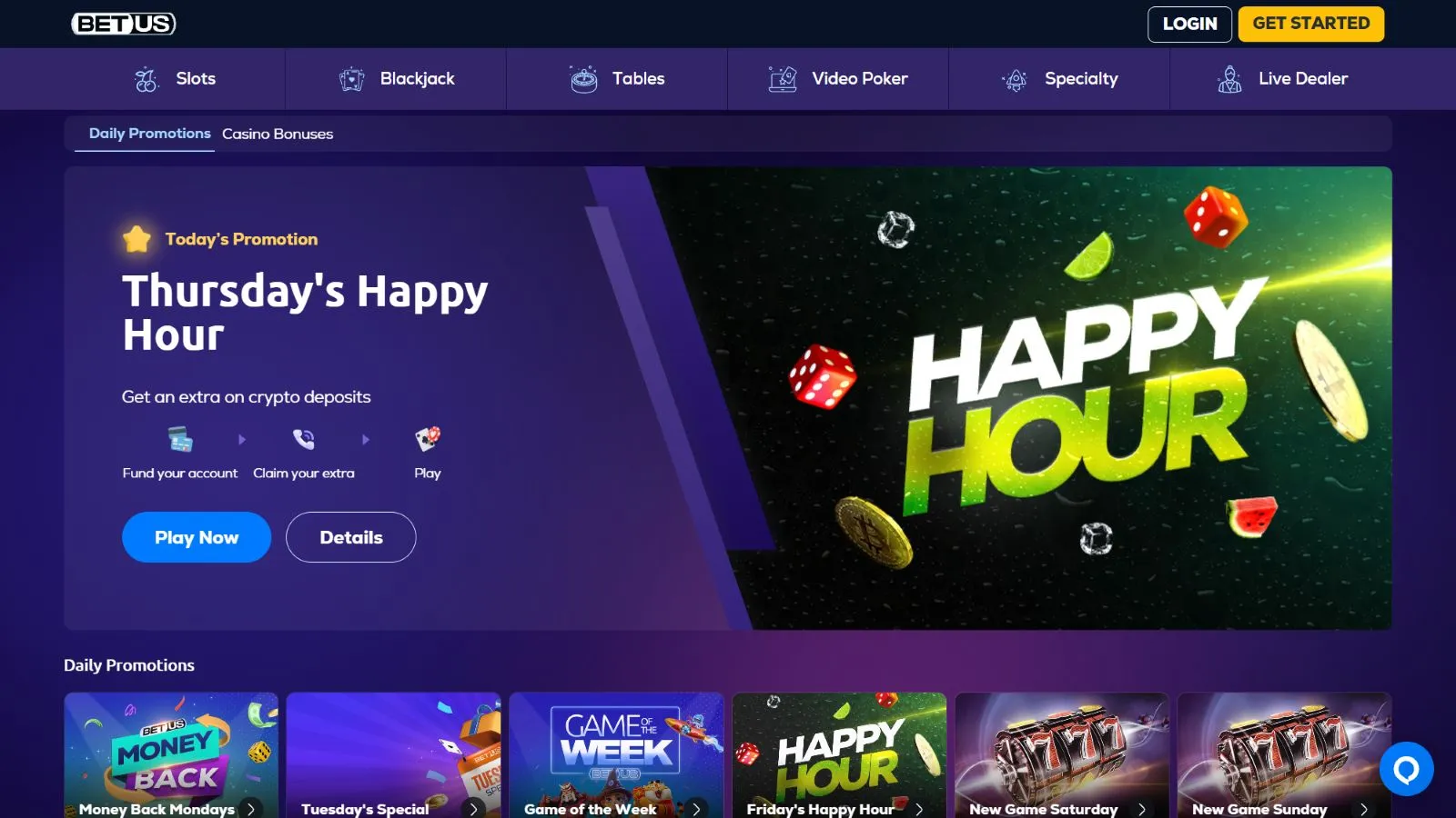 BetUS también ofrece un surtido de bonos semanales, incluyendo un bono de recarga del 50% y un bono del 50% para jugadores de blackjack. Además, también tienen una variada selección de bonos diarios para jugadores del casino y casa de apuestas deportivas, junto con un programa de referidos.