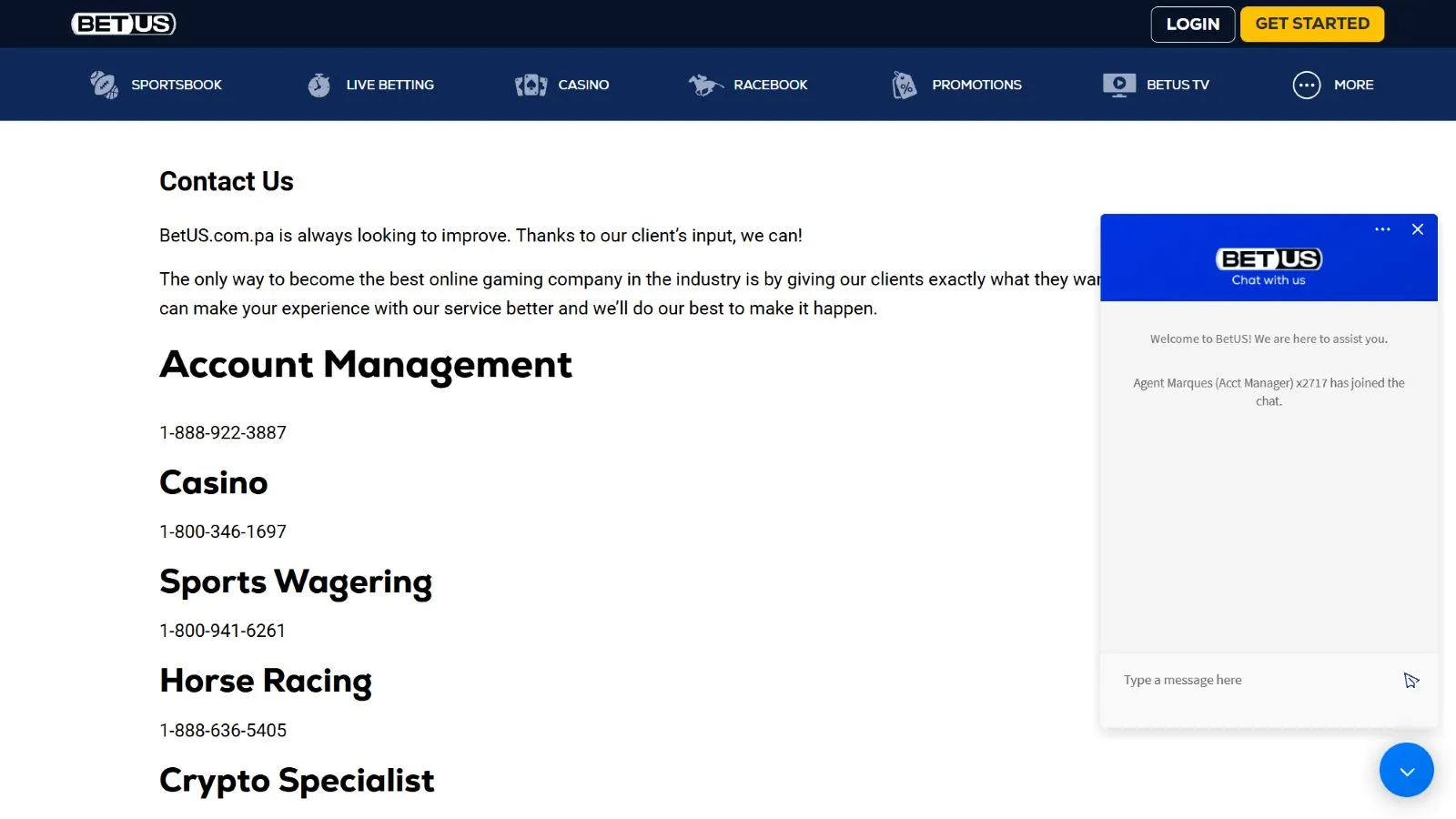 BetUS es bastante consistente con su servicio al cliente, el cual está disponible 24/7. Existen tres maneras de contactarlos: mediante un formulario de contacto (para dudas más urgentes), correo electrónico (para comunicación avanzada) o por móvil (para asistencia personal directa; los números telefónicos son asignados a varios departamentos distintos).
