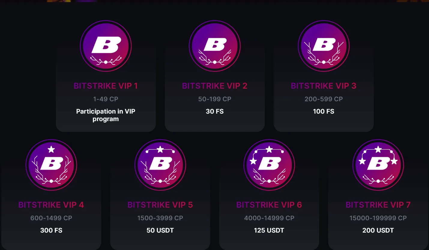 Jugar en BitStrike casino siempre es divertido y, mientras más juegas, mayor será tu entretención. Esto se debe al programa VIP popular de BitStrike. Hay diez niveles en este Programa de Fidelidad y, para alcanzar dichos niveles, deberás jugar en dinero real. Por cada 12.5 USDT en apuestas sólo en tragamonedas, recibirás 1 CP.