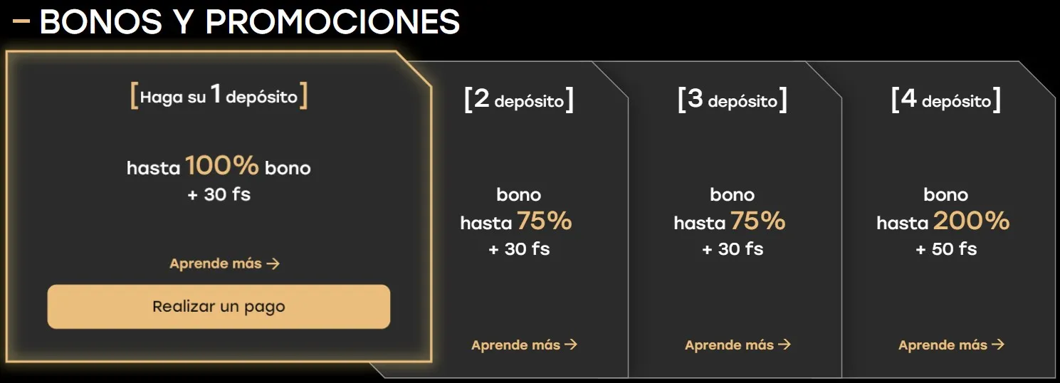 | 1 depósito | 50% + 10 tiradas gratis | 75% + 20 tiradas gratis | 100% + 30 tiradas gratis |