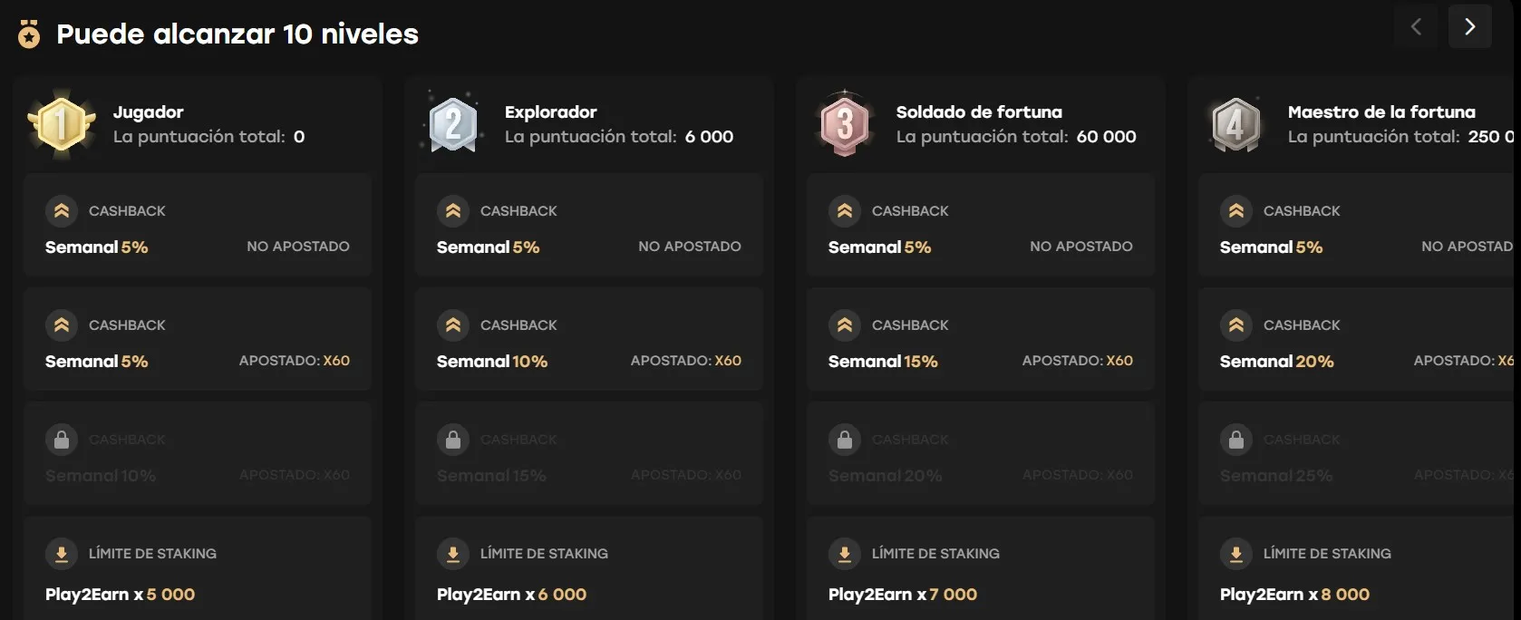 Hay un club VIP en Fairspin, y tu membresía comenzará tan pronto alcances el nivel 6 en el programa de fidelidad. Los jugadores VIP recibirán recompensas de lealtad como cashback semanal y diario, dependiendo de cuánto hayan perdido. Además, el límite de staking de Play2Earn aumenta con cada nivel.