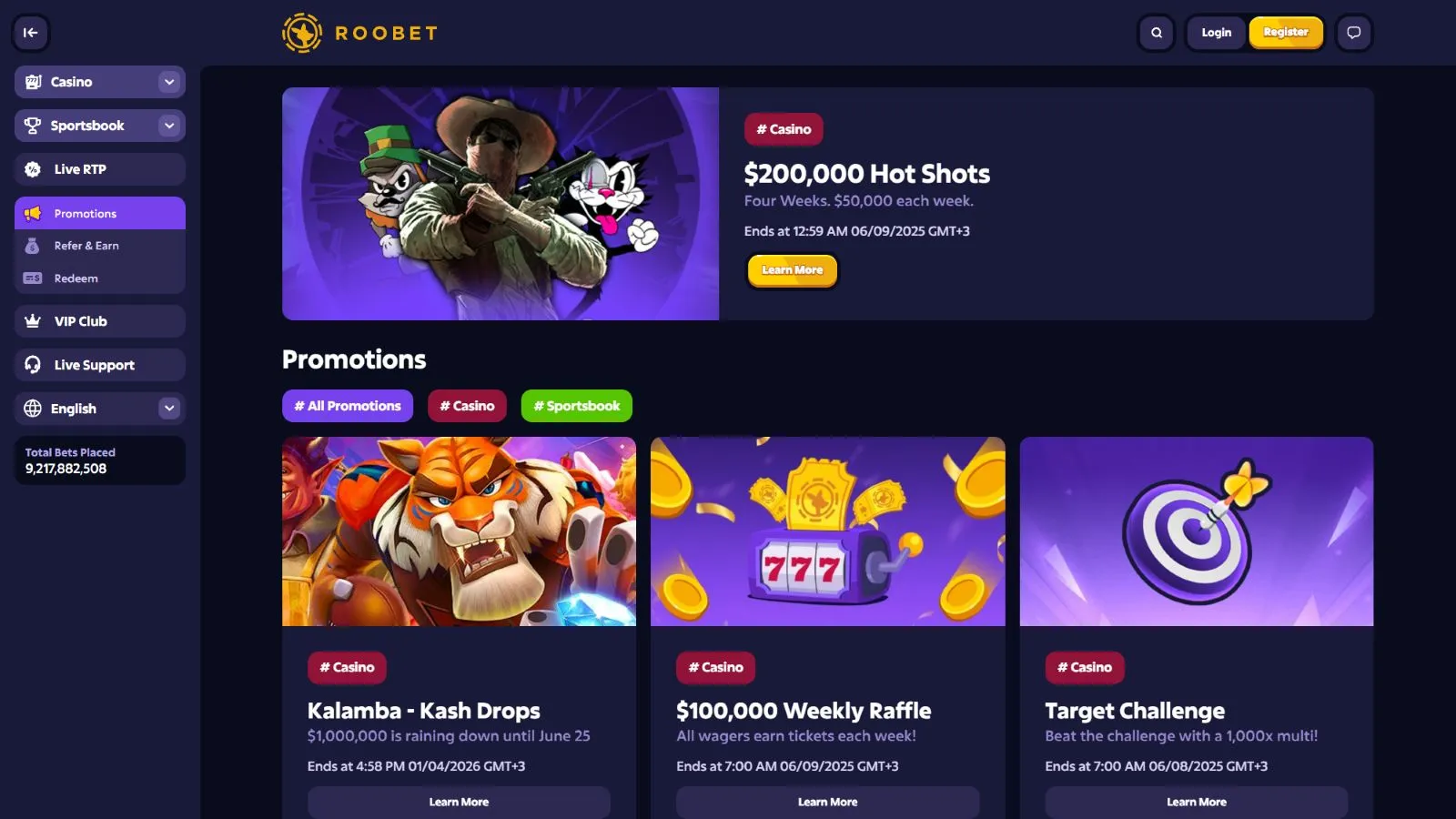 Roobet suele tener al menos una promoción única en curso la cual hace que los jugadores vuelvan a entrar al sitio. Por ejemplo, Roobet posee actualmente una promoción llamada “Roo’s $25,000 Game Show” en donde los jugadores pueden obtener boletos de rifa al realizar apuestas de al menos una cantidad establecida. Al final de la semana, 5 boletos de rifa son sorteados y el premio de $25,000 se divide entre 5 suertudos ganadores.