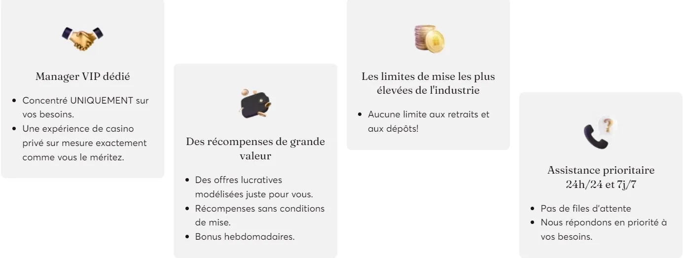 Pour devenir membre du club VIP de ce casino en ligne, vous devez être invité. C'est donc à l'opérateur de décider si vous êtes éligible sur la base d'exigences non divulguées.