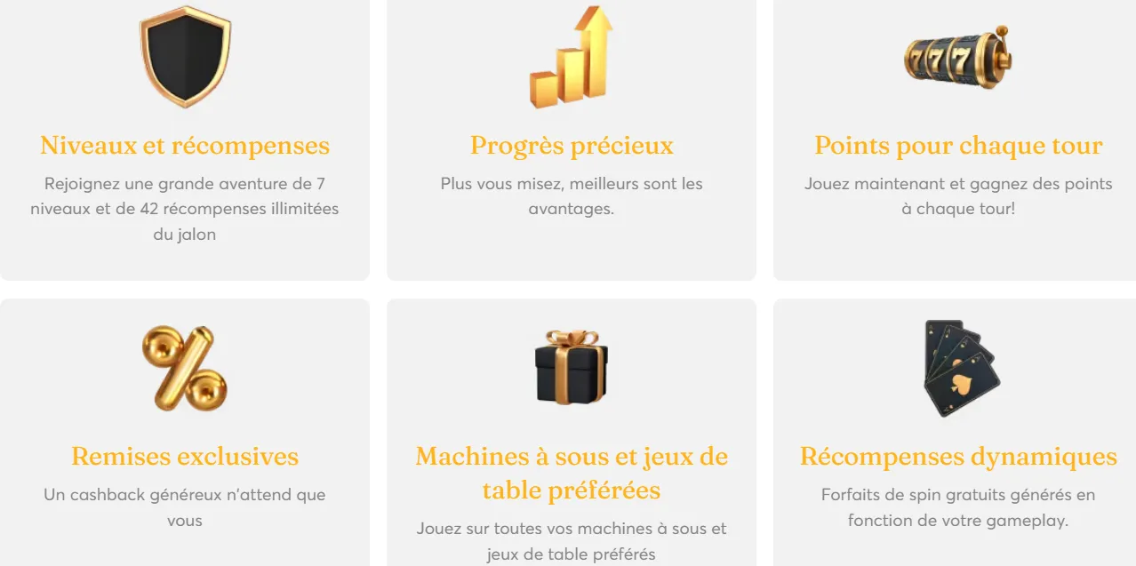 Plus vous jouez, mieux c'est ! C'est le principe du Club de fidélité. Ici, vous gagnez des points pour chaque mise. Une fois que vous avez atteint certains niveaux, vous pouvez obtenir des récompenses instantanées sans condition de mise.