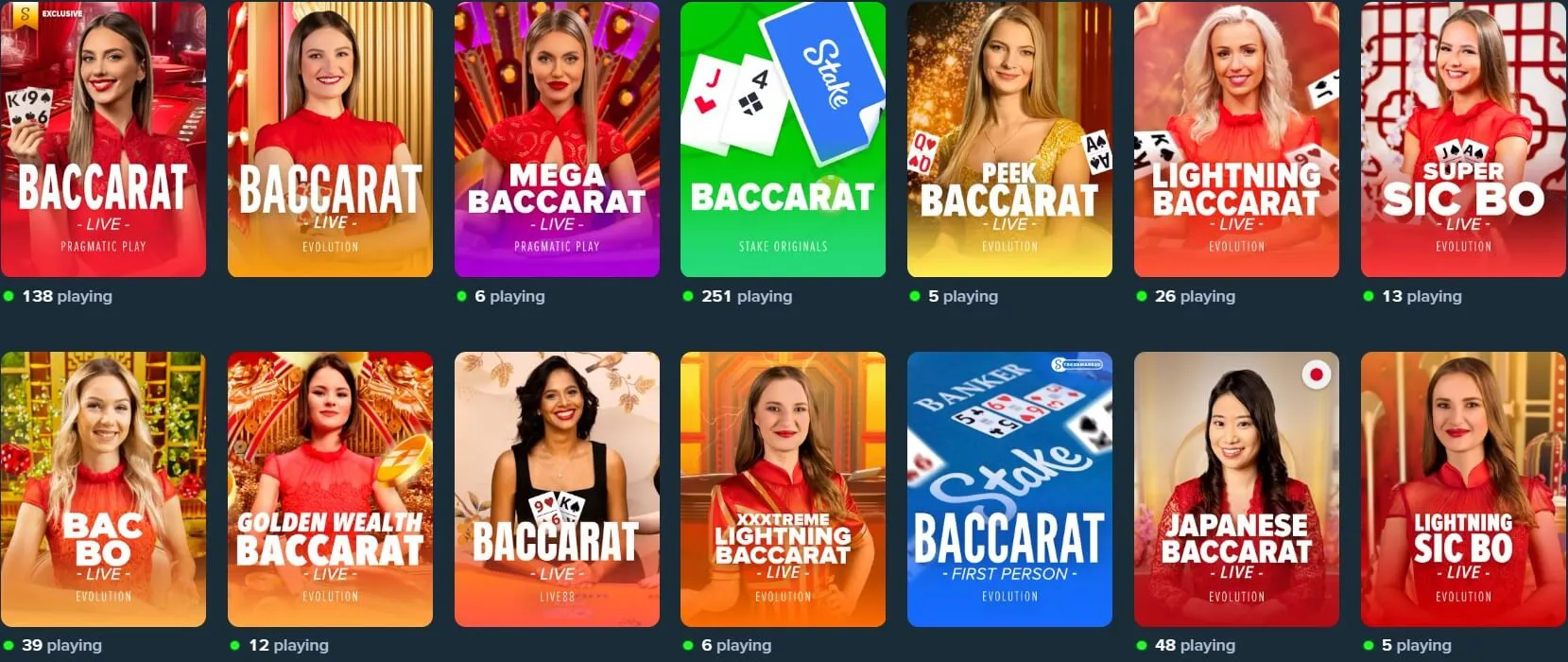 The platform has a unique game section called Stake Originals, featuring different exclusive game options, including baccarat. That version appears to be a player favorite: at the time of writing, it had the highest number of concurrent players (180+) of all the baccarat titles. - Available Games Description.