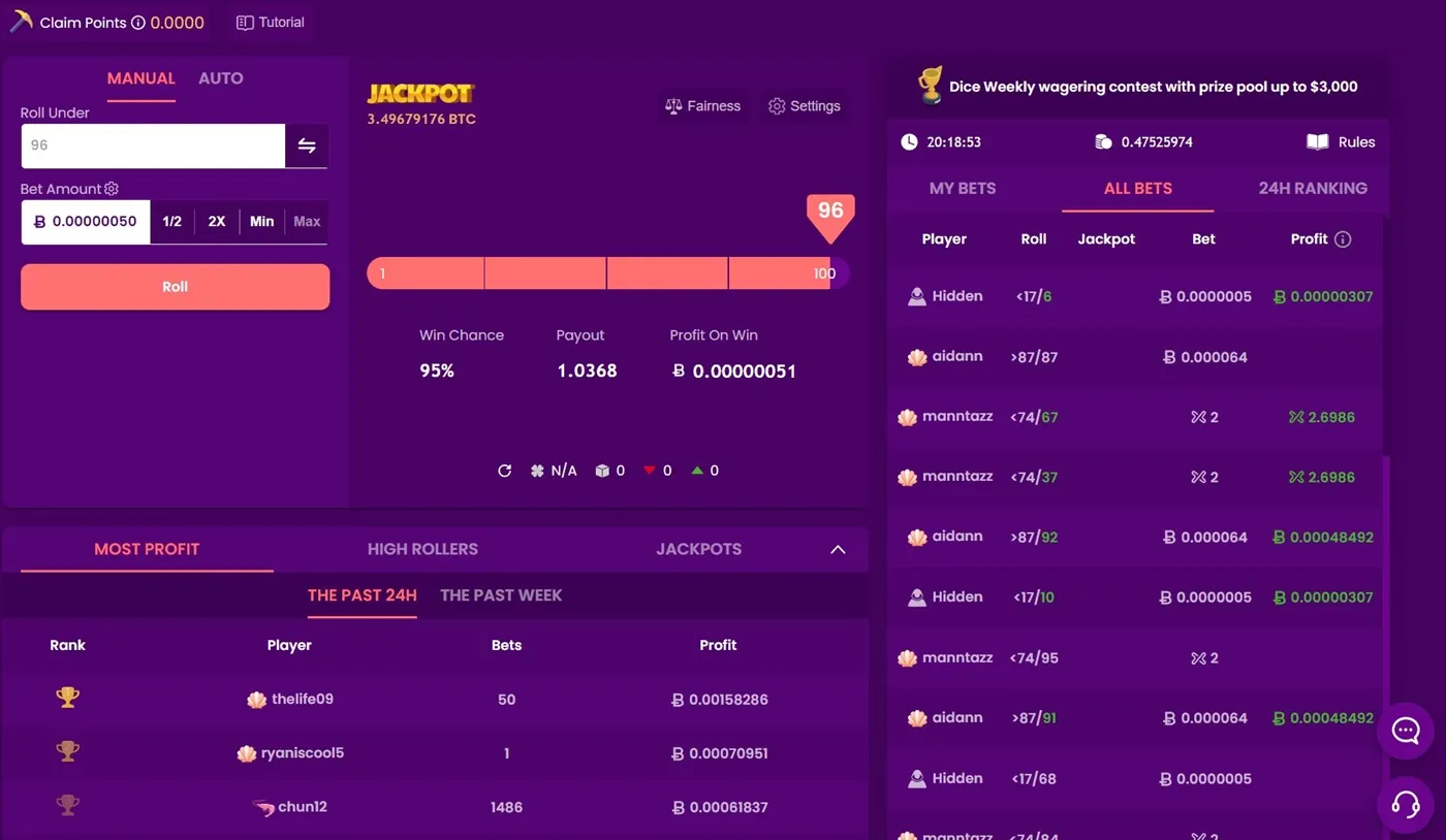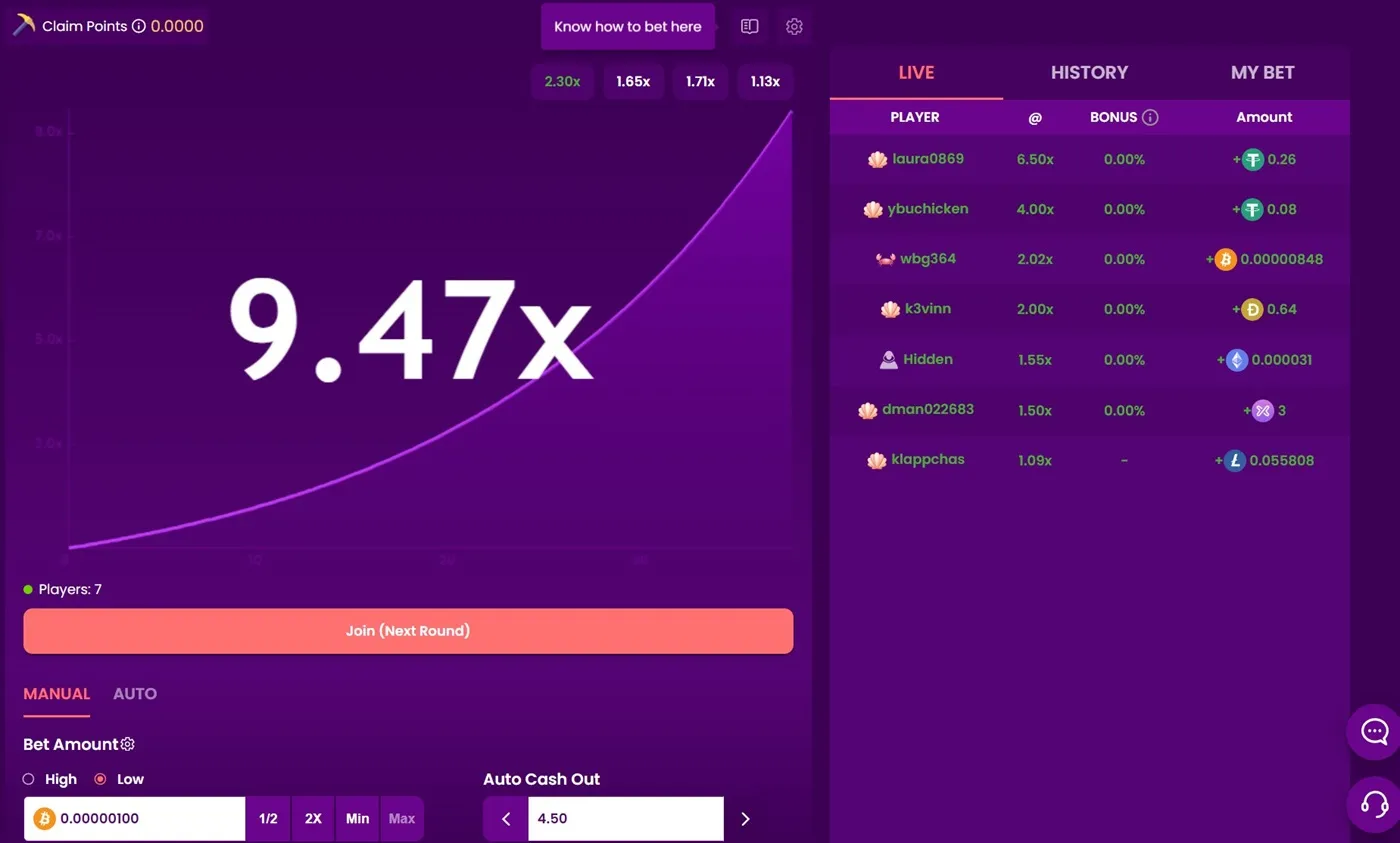 Basta piazzare una scommessa e vedere il moltiplicatore di vincita aumentare, ma assicurati di incassare prima del crash! Come i giochi di dadi di TrustDice, anche i giochi di crash utilizzano la tecnologia blockchain Provably Fair, che garantisce un'esperienza di gioco online trasparente ed equa.