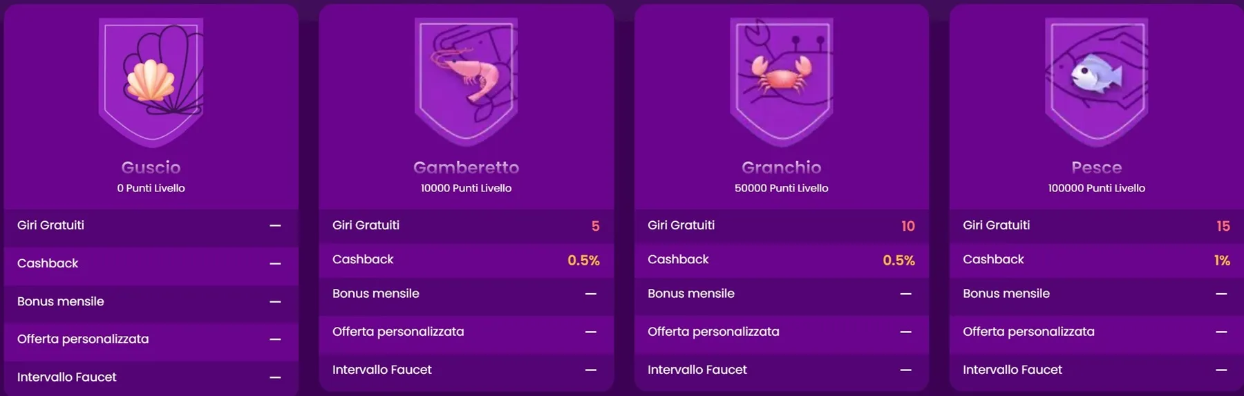 | Bonus personalizzato | Ogni volta che avanzi nei livelli, il casinò ti assegna un bonus unico. | Squalo |