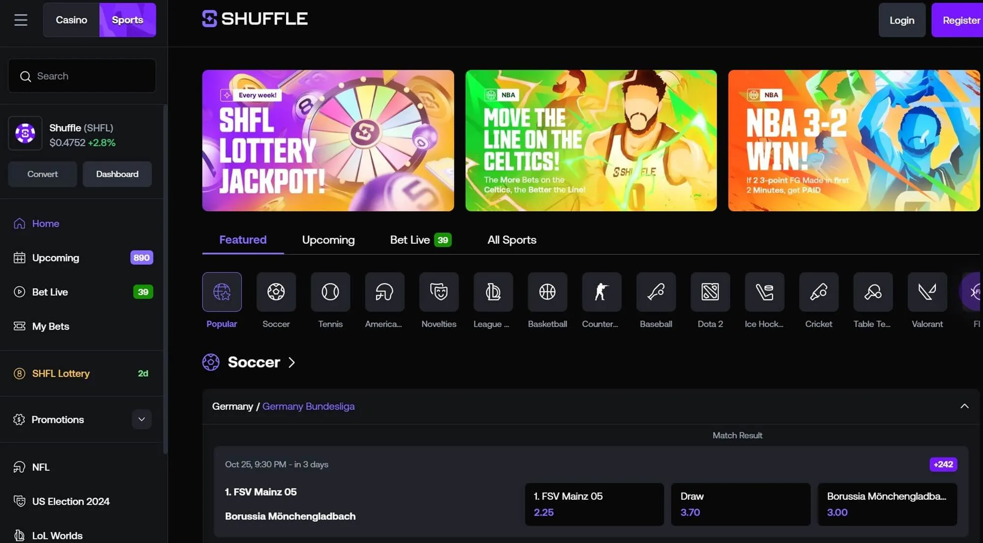 Shuffle의 스포츠북은 이제 펀터를 위한 많은 흥미로운 베팅 옵션을 구비하고 문을 열었습니다. 스포츠 탭으로 전환하면 40개 이상의 스포츠와 e스포츠에 걸쳐 수천 개의 도박 시장이 펼쳐집니다. 다양한 국가의 모든 좋아하는 이벤트를 찾아 베팅할 수 있습니다다.