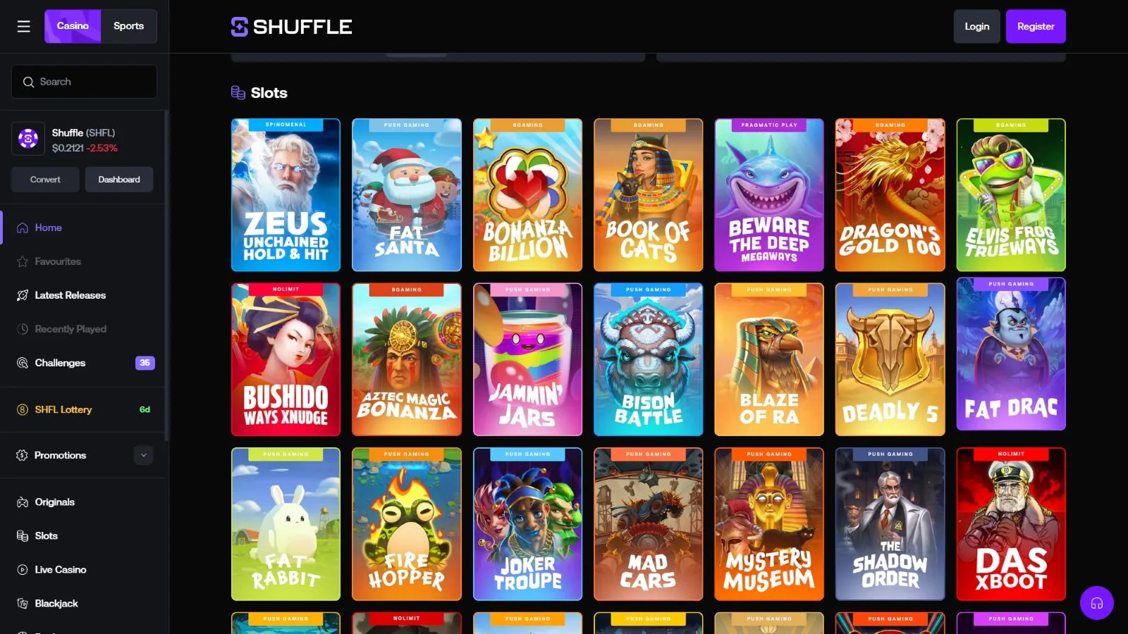 Shuffle 카지노는 신규 및 숙련된 플레이어 모두에게 적합한 직관적이고 사용자 친화적인 웹사이트를 설계했습니다. 상단 바에는 왼쪽 메뉴 바를 확장하거나 축소할 수 있는 화살표 버튼이 있어 탐색이 더욱 원활합니다. 화살표 버튼 옆에는 검색 필드, 계좌 잔액, 지갑, VIP 섹션, 공개 채팅 버튼, 프로필 드롭다운 메뉴가 있습니다. 이러한 기능은 웹사이트의 주요 섹션에 쉽게 접근할 수 있도록 하여 매끄럽고 즐거운 경험을 보장합니다.