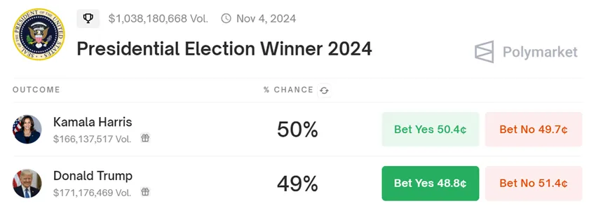 Political betting markets are on fire as the 2024 US Presidential Election approaches. Current vice president, Kamala Harris's odds of winning are currently at 50% while Donald Trump is closely at 49%, according to crypto betting exchange Polymarket.