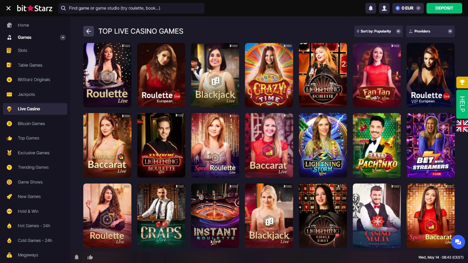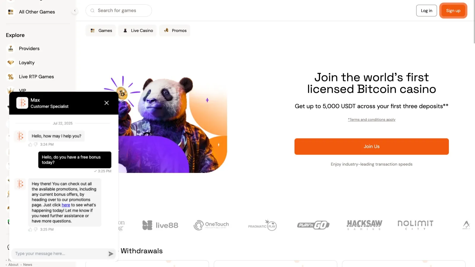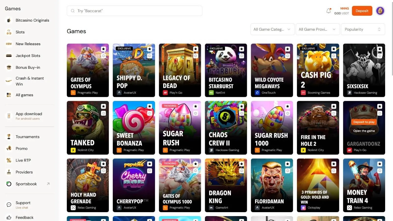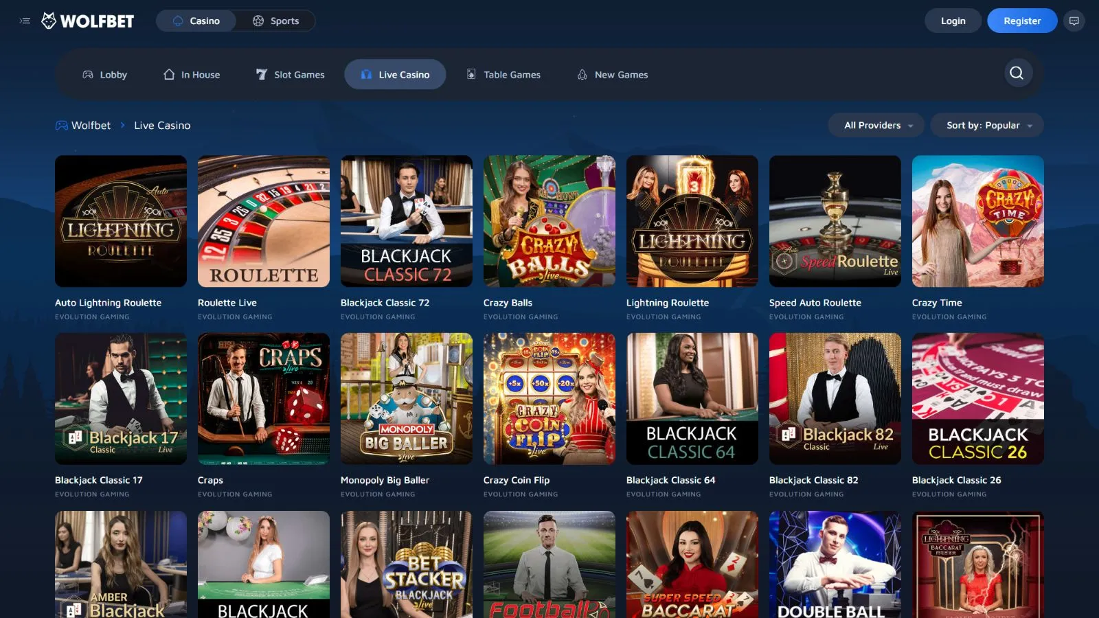 Ethereum games include titles from popular providers and Provably Fair games by Steady Games and Orbital. There are also slots, table games, and games with live dealers from Authentic Gaming, BetGames TV, Evolution Gaming, and Pragmatic Play.