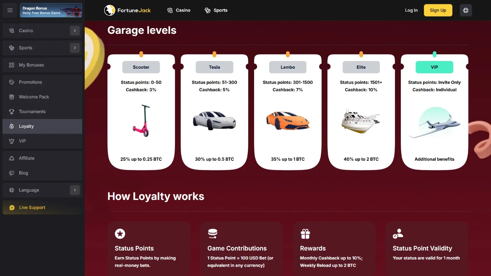 FortuneJack creates separate promotions for both casino gaming and Ethereum sports betting buffs. If you register and verify an account, the casino will grant you 100 free spins with no wagering requirement. FortuneJack also has a loyalty program where you can get up to 10% as a cashback bonus and a 40% deposit bonus up to 2 BTC.
