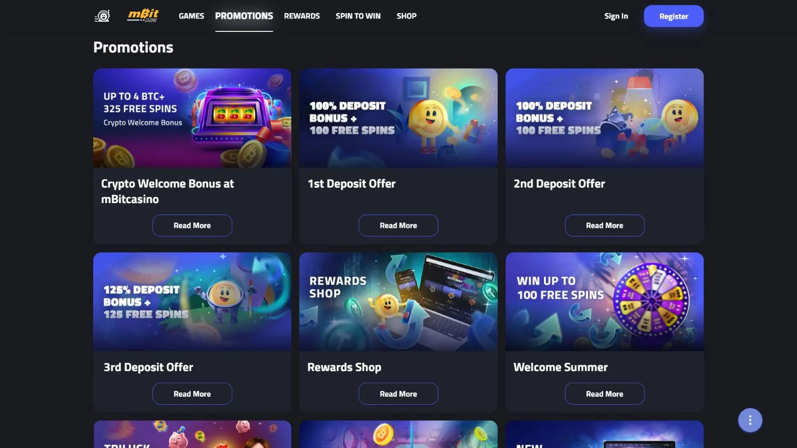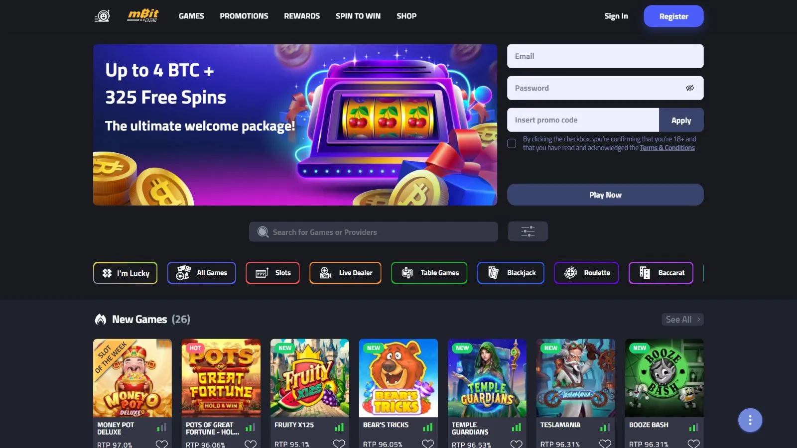 mBit promotions start with a huge welcome package. Users of this casino can get up to 4 BTC and 325 free spins on their first three deposits. Later on, they will be able to make use of an additional 35% reload bonus on Fridays, as well as bonuses from temporary promotions.