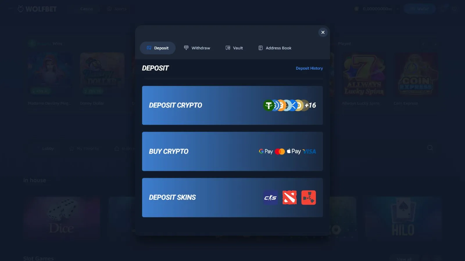 The deposit process is fairly consistent regardless of the Ethereum online casino that you decide to use. It all involves going to the deposit page, getting the wallet address, and transferring the money from your crypto wallet.