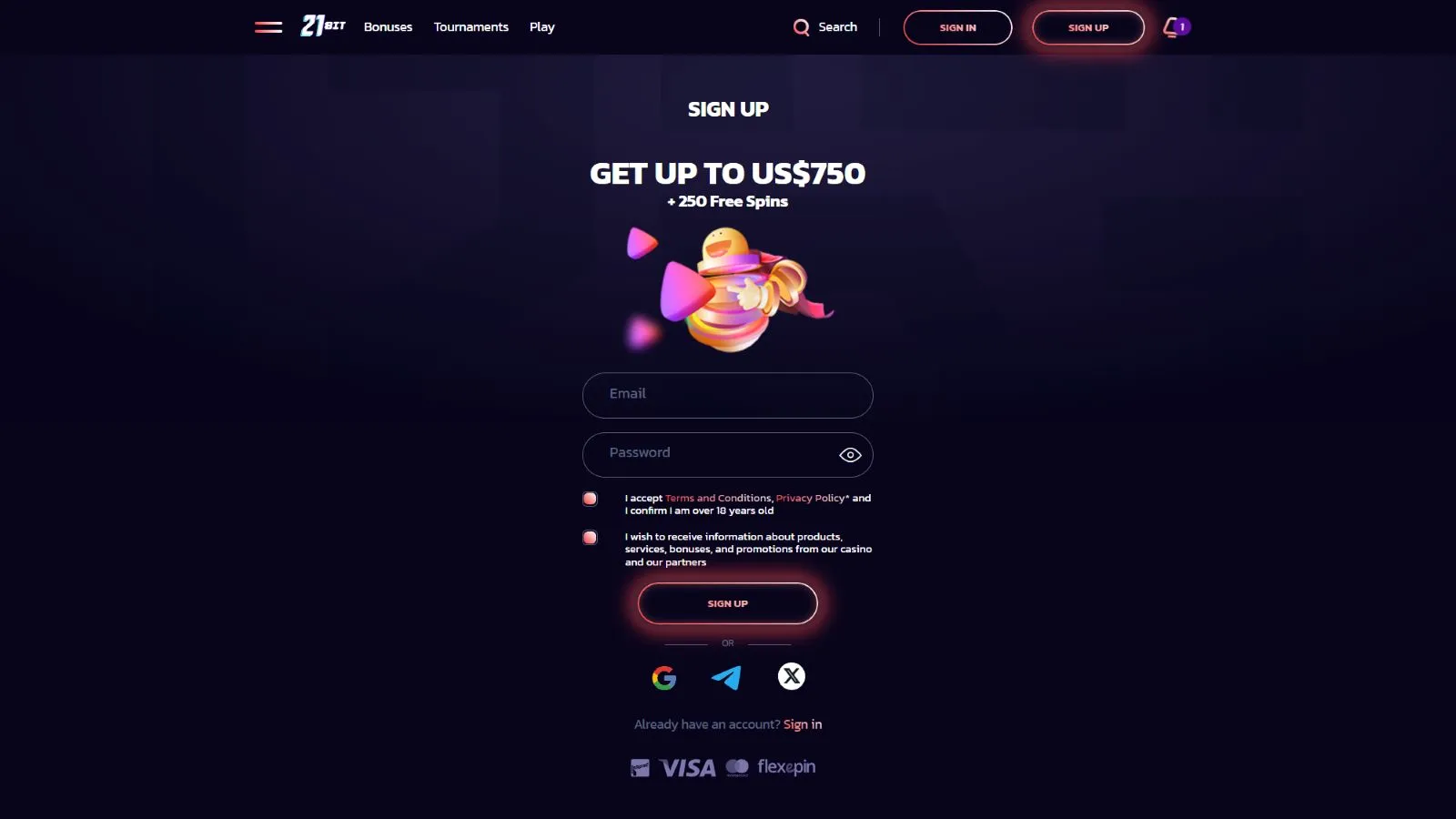 Jest to bardzo prosty krok, który każdy z Was musi wykonać, aby móc grać w 21Bit casino. Po prostu kliknij na przycisk “Sign Up” w górnym menu, wybierz nazwę użytkownika, wpisz swój adres e-mail i wybierz silne hasło. Potwierdź, że masz co najmniej 18 lat, klikając na odpowiednie pole wyboru i naciśnij przycisk “Sign Up”.