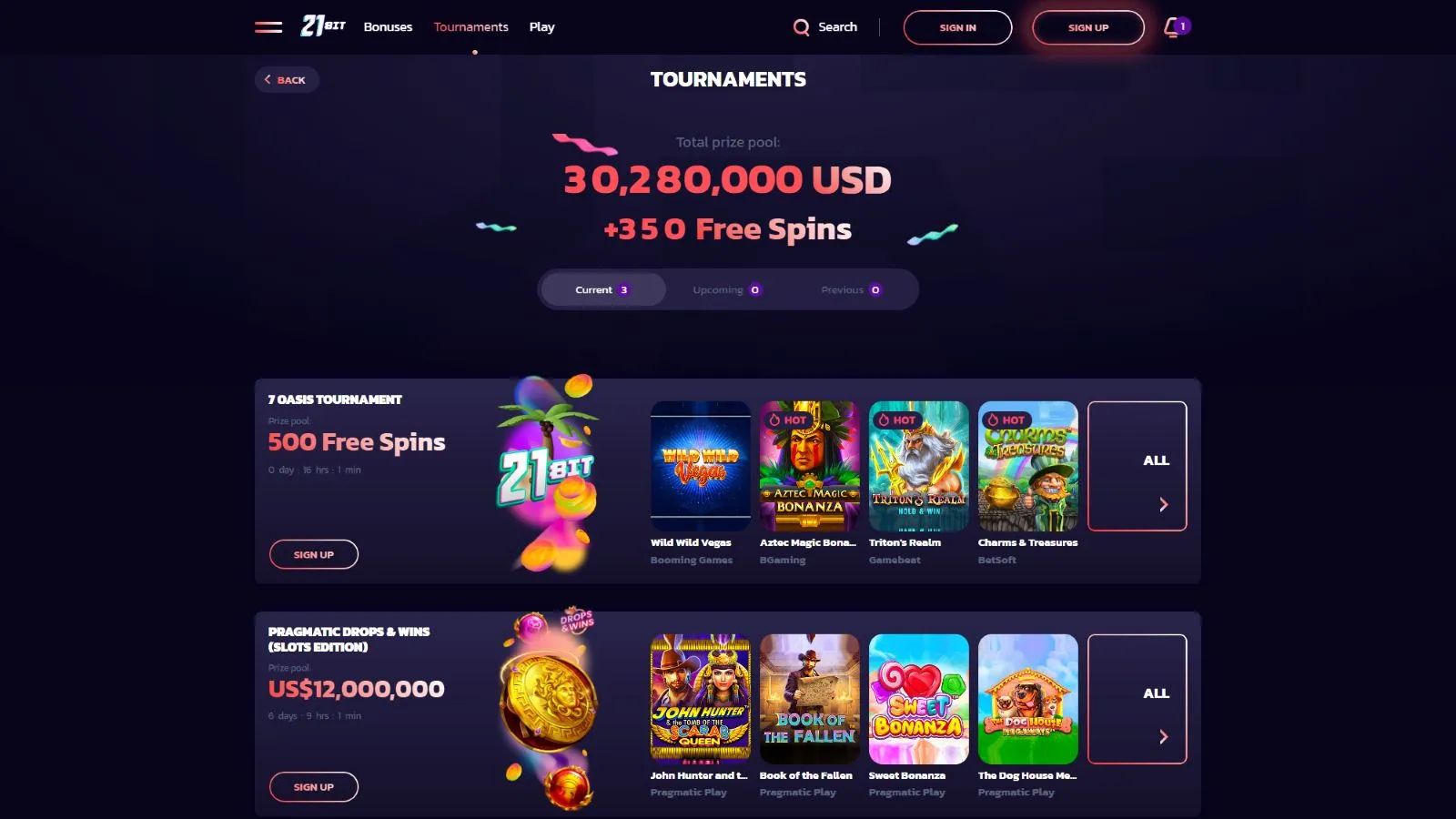 Gra w turniejach kasynowych może być naprawdę zabawna. Jednak w tej chwili w 21Bit casino nie ma żadnych aktywnych turniejów kasynowych. Dobra wiadomość jest taka, że widzimy, iż kasyno pracuje nad dodaniem kilku turniejów, więc musimy jeszcze trochę poczekać.