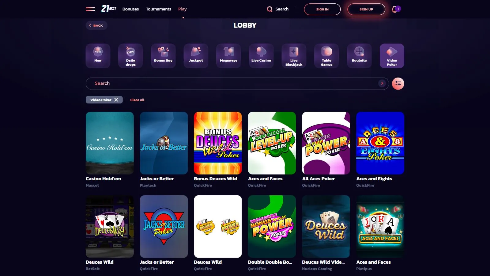 W 21Bit Casino jest wiele stołów pokerowych, na których można obstawiać zakłady. To świetnie, ponieważ poker jest bardzo popularną grą wśród graczy kasynowych. Aby znaleźć gry w pokera, możesz wpisać słowo “poker” w pasku wyszukiwania. W ten sposób natkniesz się na takie nazwy, jak Magic Poker, Three Card Poker, Triple Edge Poker, Joker Poker, Turbo Poker, Casino Stud Poker, Caribbean Poker, American Poker V, Oasis Poker, Double Double Bonus Poker, Super Video Poker, Ride’m Poker, Trey Poker i wiele innych.