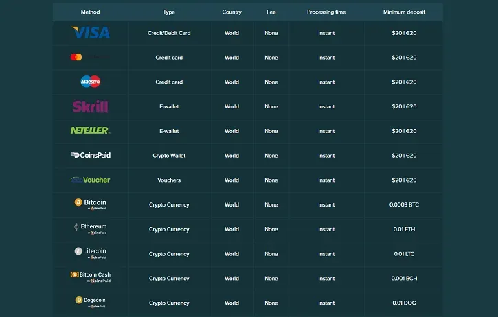 Jedną z głównych zalet platformy jest obsługa popularnych kryptowalut. Możesz dokonywać wpłat za pomocą