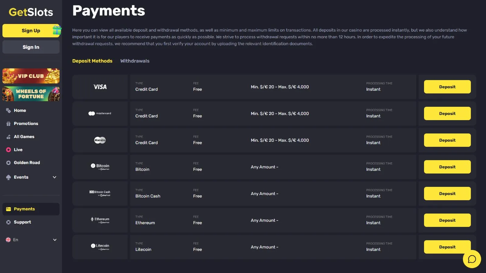 W kasynie GetSlots minimalne limity wpłat / wypłat różnią się w zależności od używanej metody. Aby jednak ubiegać się o bonus powitalny, należy wpłacić co najmniej 20 USD lub równowartość w kryptowalutach. Kasyno GetSlots umożliwia również ustalanie limitów wpłat, to odbywa się za każdym razem, gdy odwiedzasz witrynę. Taki mechanizm udostępnia się aby zachęcić do odpowiedzialnego i kontrolowanego hazardu.