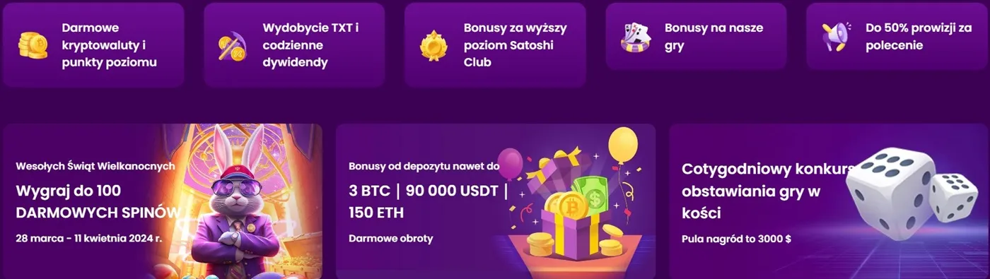 Możesz stakować swoje tokeny TXT i zacząć zarabiać codzienne dywidendy w pięciu różnych kryptowalutach: Bitcoin (BTC), Ethereum (ETH), EOS, Tether (USDT) i USD Coin (USDC). TXT to unikalny token kryptowalutowy kasyna, zbudowany na blockchainie EOS. Stakując TXT, możesz zarabiać kryptowalutowe dywidendy. Dodatkowo możesz użyć TXT, aby zagrać w ekskluzywną grę crash TrustDice.