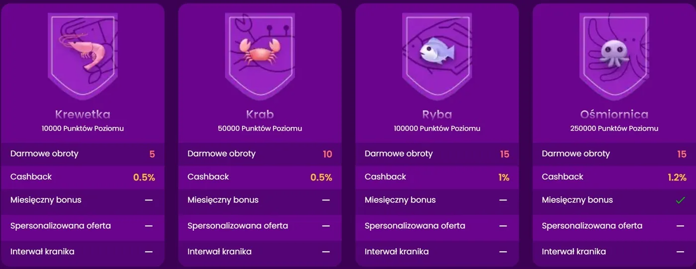 | Korzyści z awansu na wyższy poziom | Za każdym razem, gdy awansujesz na kolejny poziom, otrzymujesz określoną liczbę darmowych spinów. Najlepsze jest to, że nie ma żadnych warunków obrotu. | Krewetka |