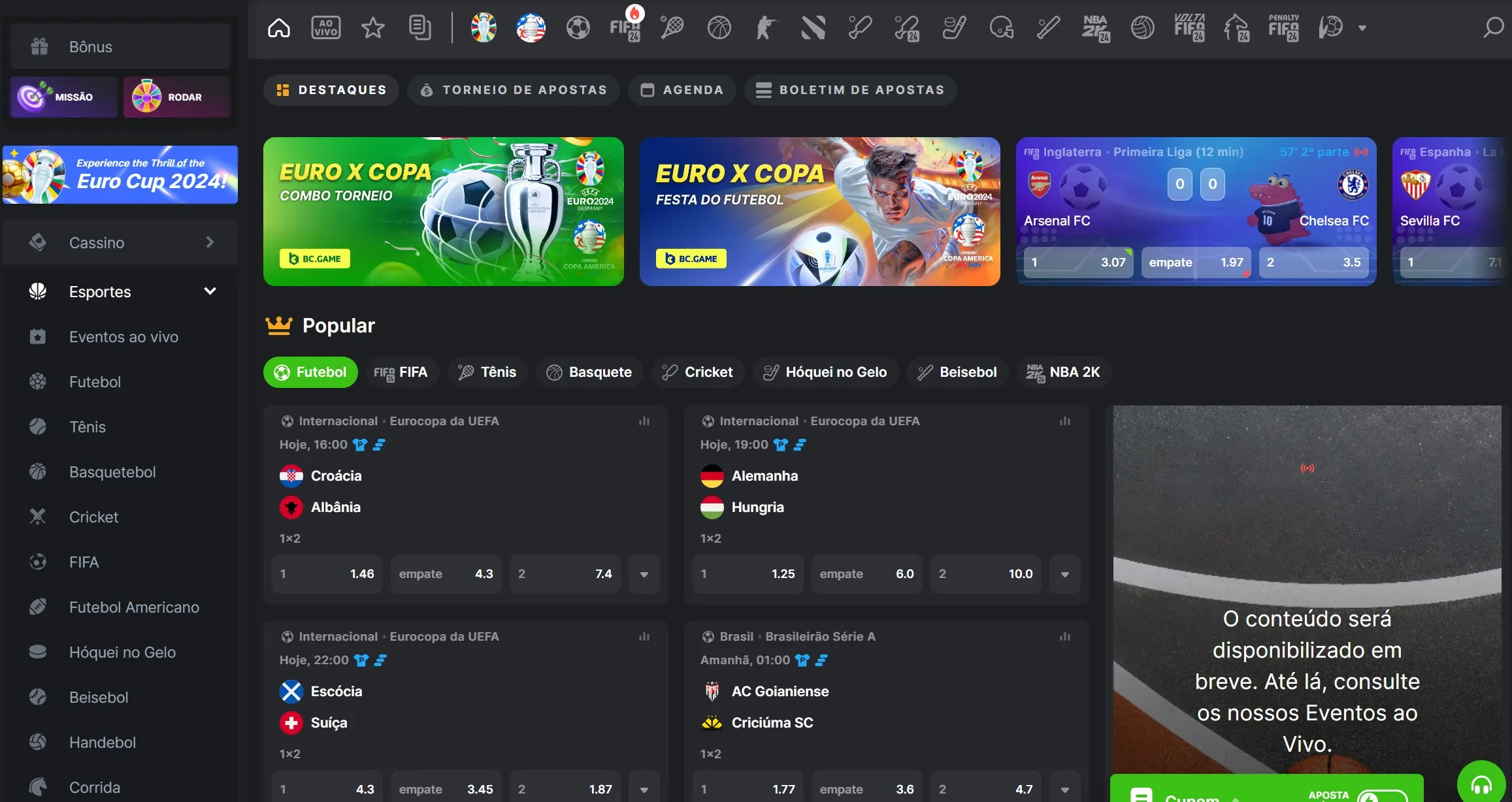 Semelhante à seção de cassino, o BC.Game se destaca em sua seção de esportes ao oferecer mais de 45 modalidades. Os eventos populares no site incluem: