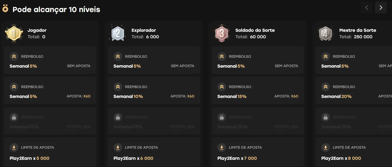 Há um clube VIP no Fairspin, e sua assinatura começará assim que você atingir o nível 6 no programa de fidelidade. Jogadores VIP receberão recompensas de fidelidade como cashback semanal e diário, dependendo de quanto perderam. Além disso, o limite de apostas do Play2Earn aumenta a cada nível.