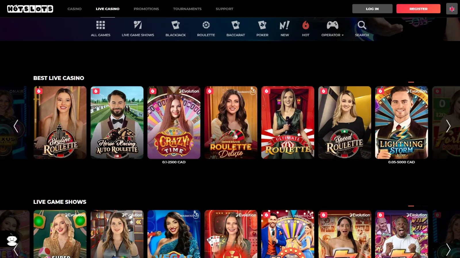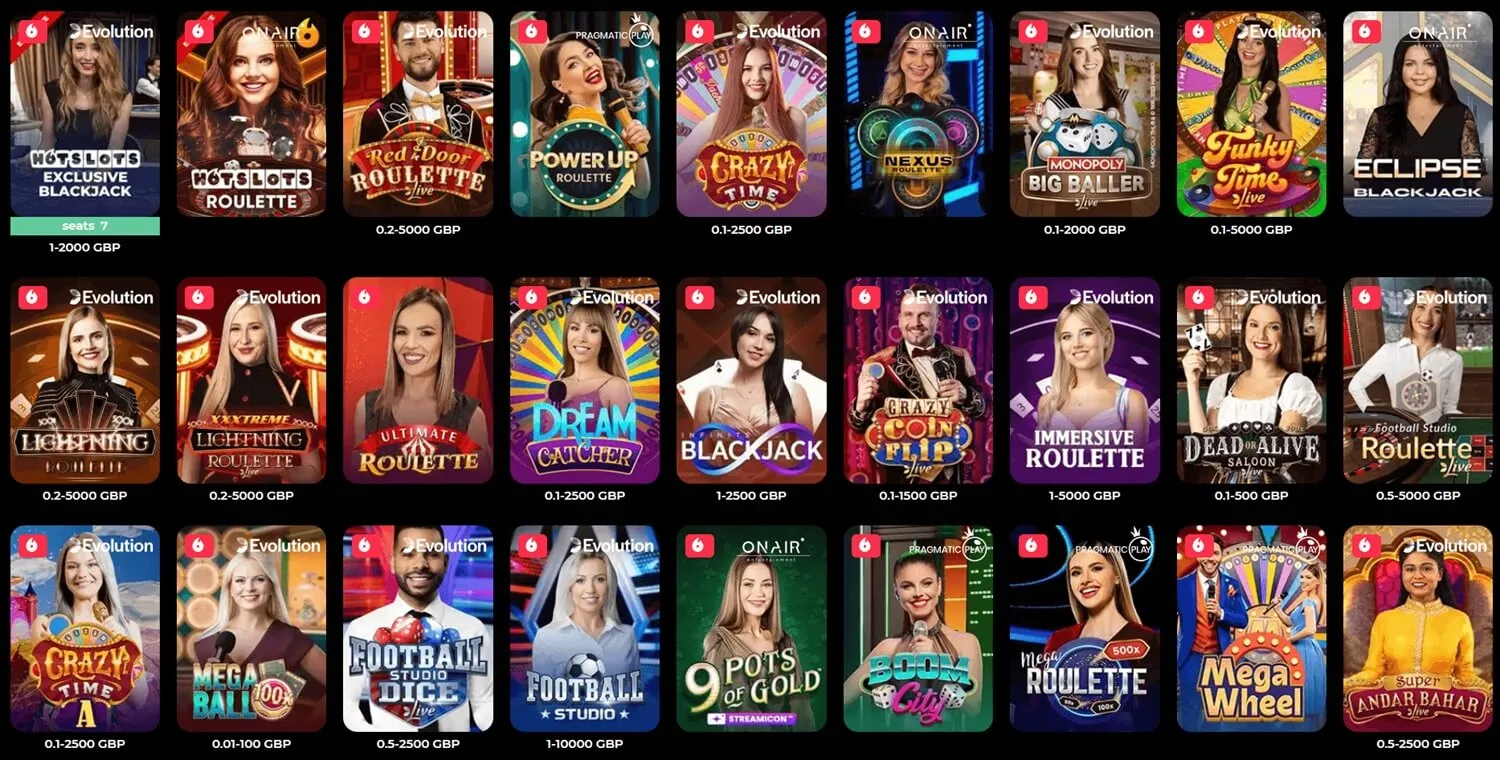 Ao acessar a página de Cassino ao vivo, você poderá começar a jogar nas melhores mesas com dealer ao vivo do cassino HotSlots.io. Como de costume, muitos tipos de Blackjack, Roleta, Baccarat e Poker podem ser encontrados lá. Portanto, se você quiser experimentar algo mais do que jogar em jogos de mesa normais, esses jogos permitem que você veja a pessoa real que está liderando o jogo em sua tela.