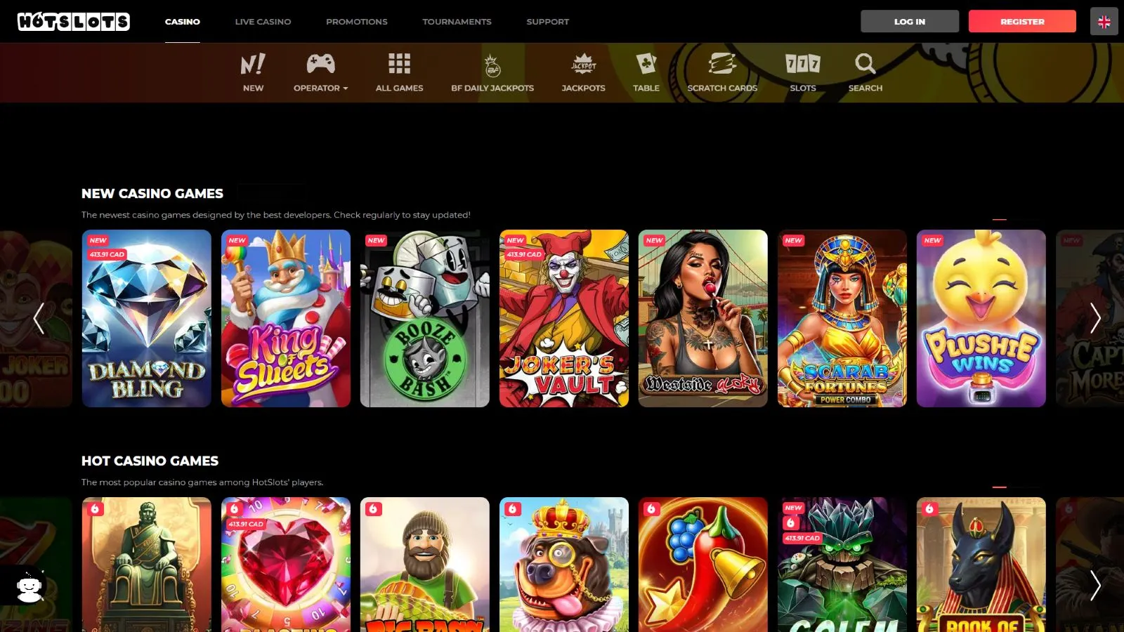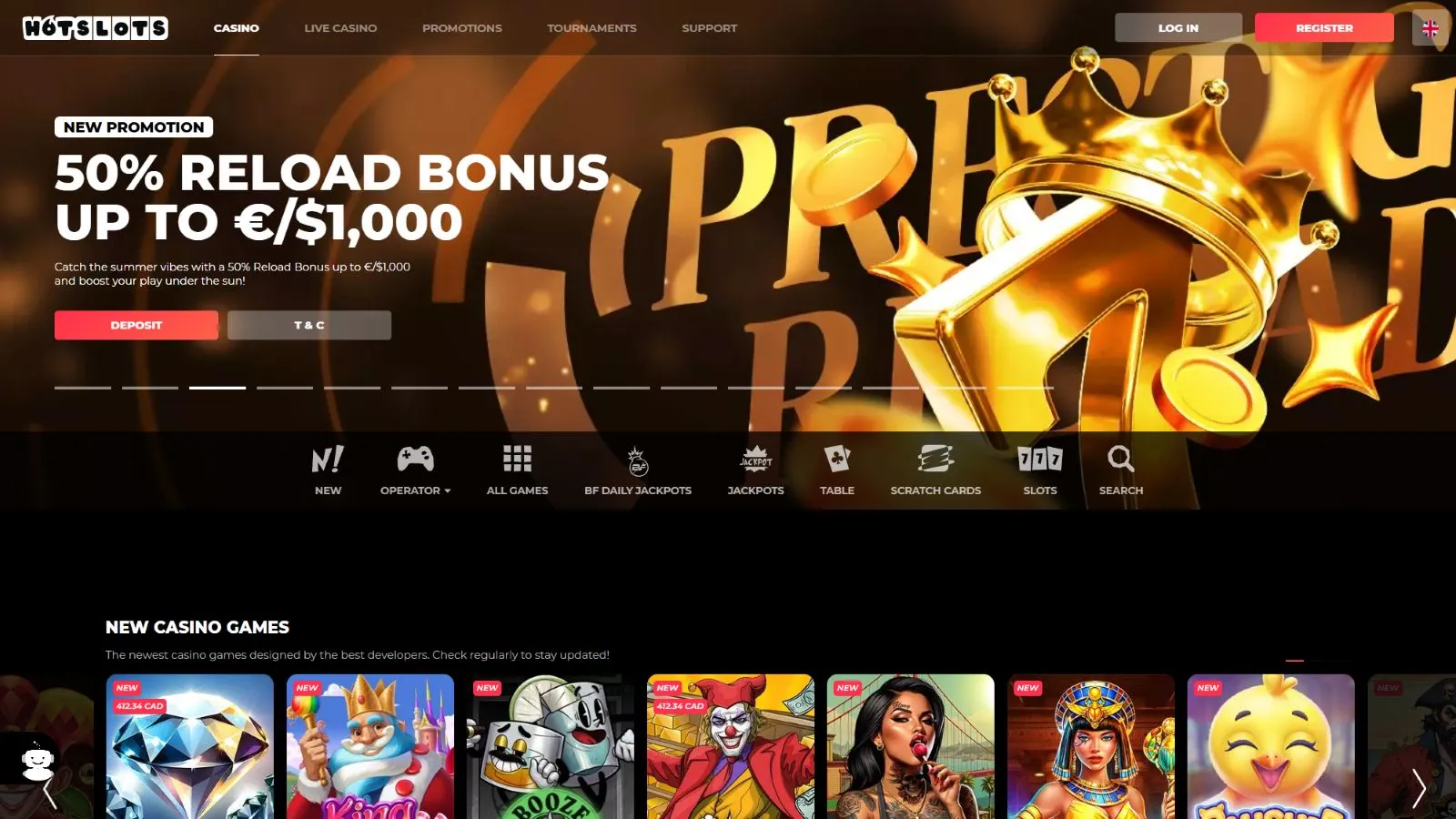 O cassino HotSlots usa um site moderno com recursos interessantes e imagens sofisticadas. Quando você estiver na página inicial, no topo da página você verá uma barra a partir da qual você pode navegar para as seguintes páginas: Cassino, Cassino ao vivo, Promoções, Torneios e Suporte. Na mesma barra, num lugar específico, você verá seu saldo atual, um botão de “mais” (botão de Depósito), um menu suspenso de perfil, notificações e idioma.