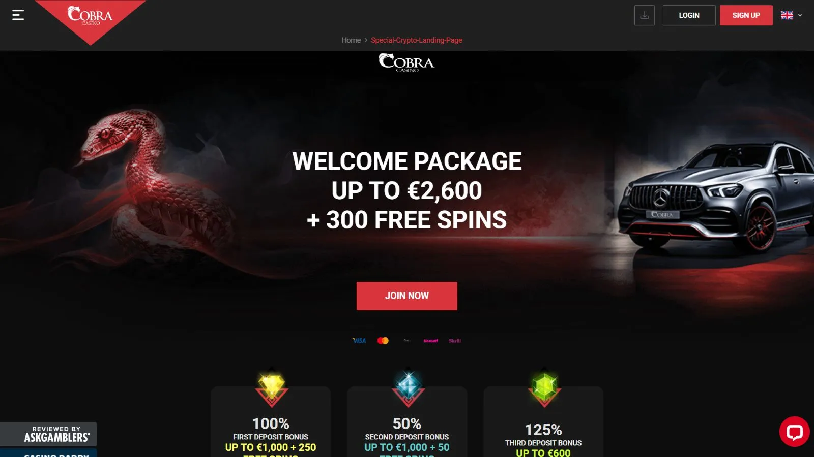 Se você for um grande apostador, o CobraCasino oferece um bônus de depósito especial para você, ele estará disponível duas vezes por mês. Ao usar o código de bônus VIP50, você receberá um bônus de 50% até €1.000. Para transformar o saldo de bônus em dinheiro real, você precisa apostar 40 vezes o valor do montante. Além disso, confira o programa VIP do CobraCasino, nele você pode ganhar mais spins grátis, prêmios em dinheiro, bônus de depósito e cashback de até 10%.