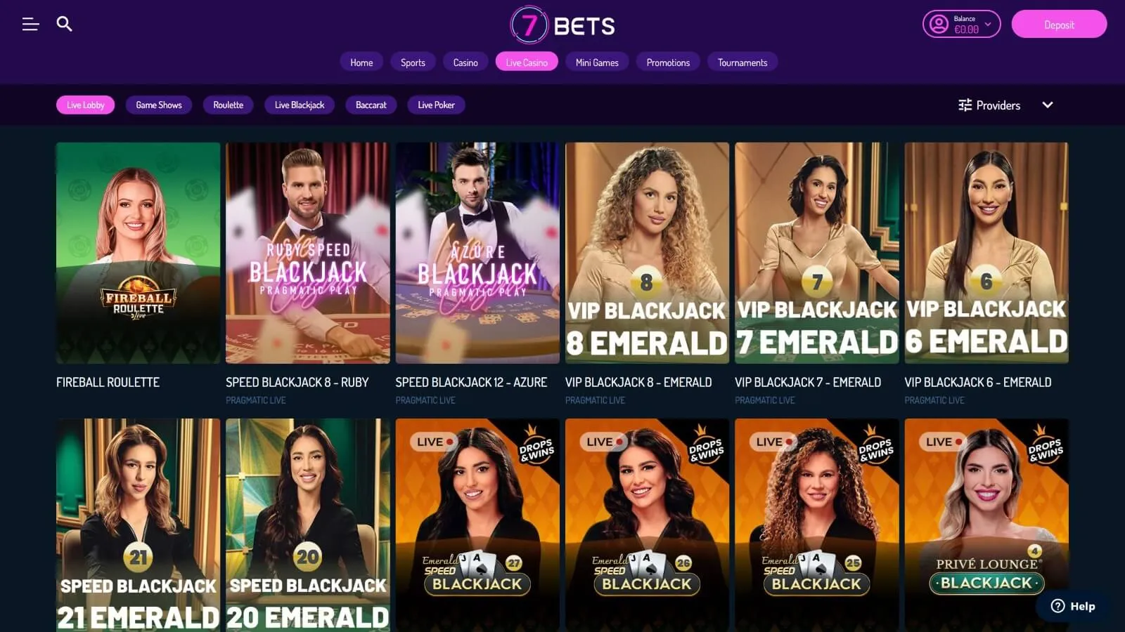7Bets live casino lobby is powered by 9 game providers, including Evolution Gaming, Pragmatic Live, Luckystreak, 7Mojos, and BombayLive.