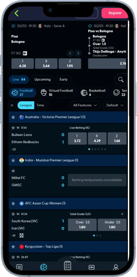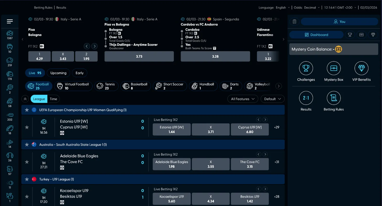 The interface of this section makes the live events quite prominent. The design grants you quick access to bet slips, booking IDs, and odds settings for accumulators or custom views.