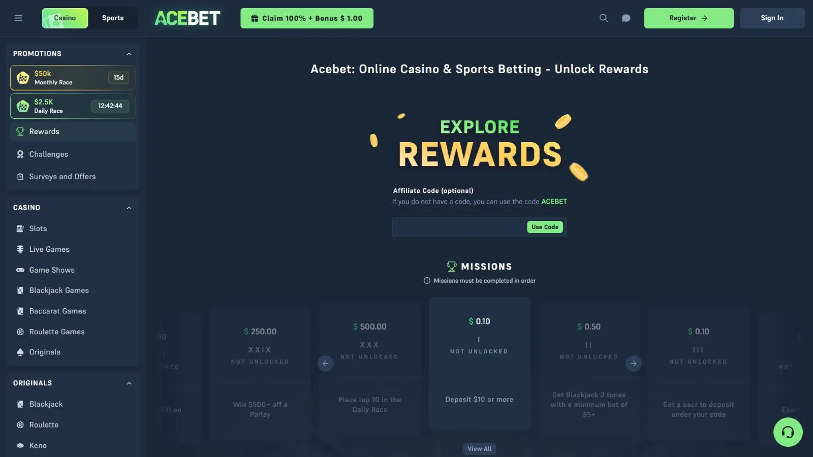 - Visit Acebet online casino