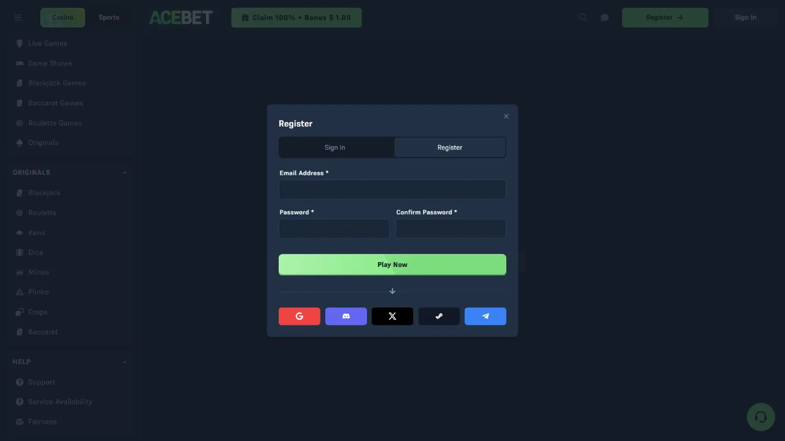 Acebet allows registration via email or social media apps like Google, Discord, X, Steam, and Telegram.