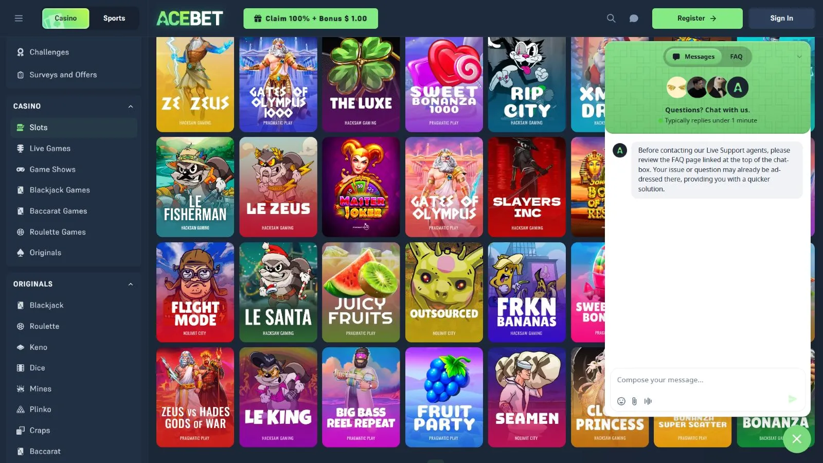 Withdrawing your winnings is easy at Acebet. As long as you’ve wagered your deposit or bonus at least once, you’re good to go. Just submit your payout request, and it will be processed within 5 minutes.