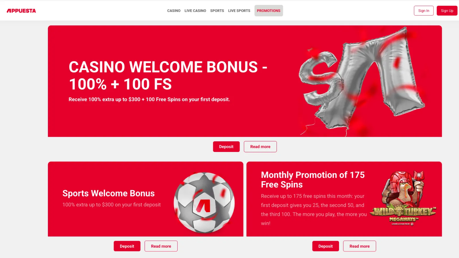 Appuesta Casino offers several promotions, including free spins, reload bonuses, and VIP loyalty rewards. New players can claim a casino welcome offer on their first deposit.