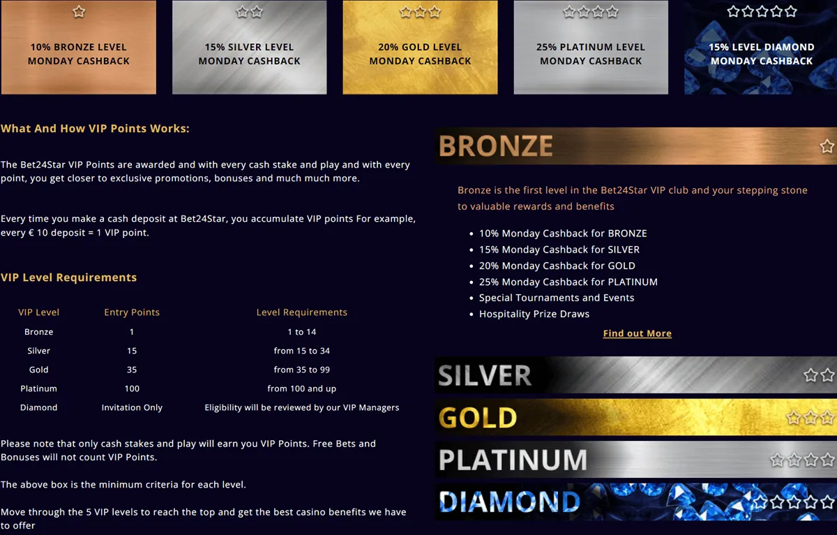 At Bet24Star, you will accumulate VIP points every time you make a deposit. For example, for every 10 Euros deposited, you will receive 10 VIP points. There are 5 levels in the VIP club, and each has VIP points requirements. However, the higher your level is, the greater rewards you will reap.