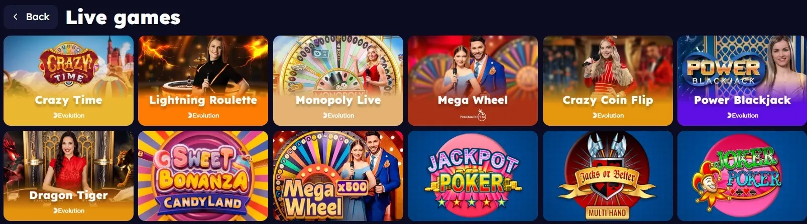 While the casino offers over 630 live titles, you’ll find just 8 game shows and Power Blackjack in the “Live Games” section of the lobby. The remaining live titles are scattered in other sections in the lobby.