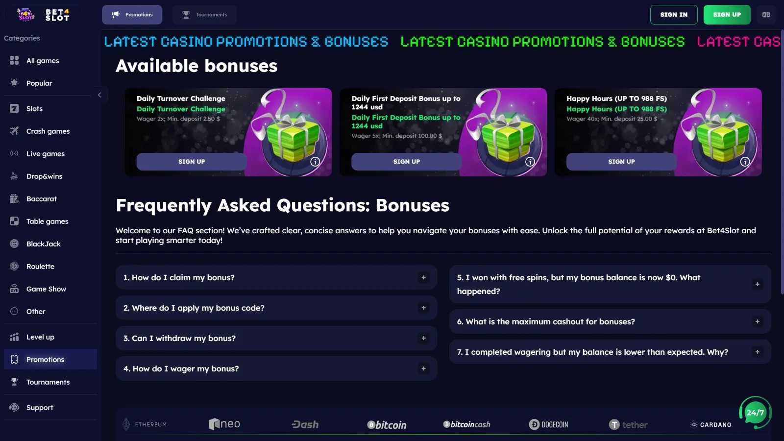 Unfortunately, there’s no FAQ or help center where you can find support articles or answers to popular questions. You can send a message to support@bet4slot.com if you need to reach the casino during the live chat offtime.