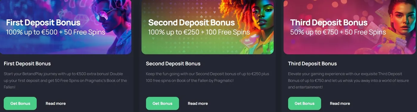 A massive welcome package of €2,500 and 300 free spins awaits new players at BetandPlay. From your first to fourth deposits, you will get both cash bonuses and free spins.