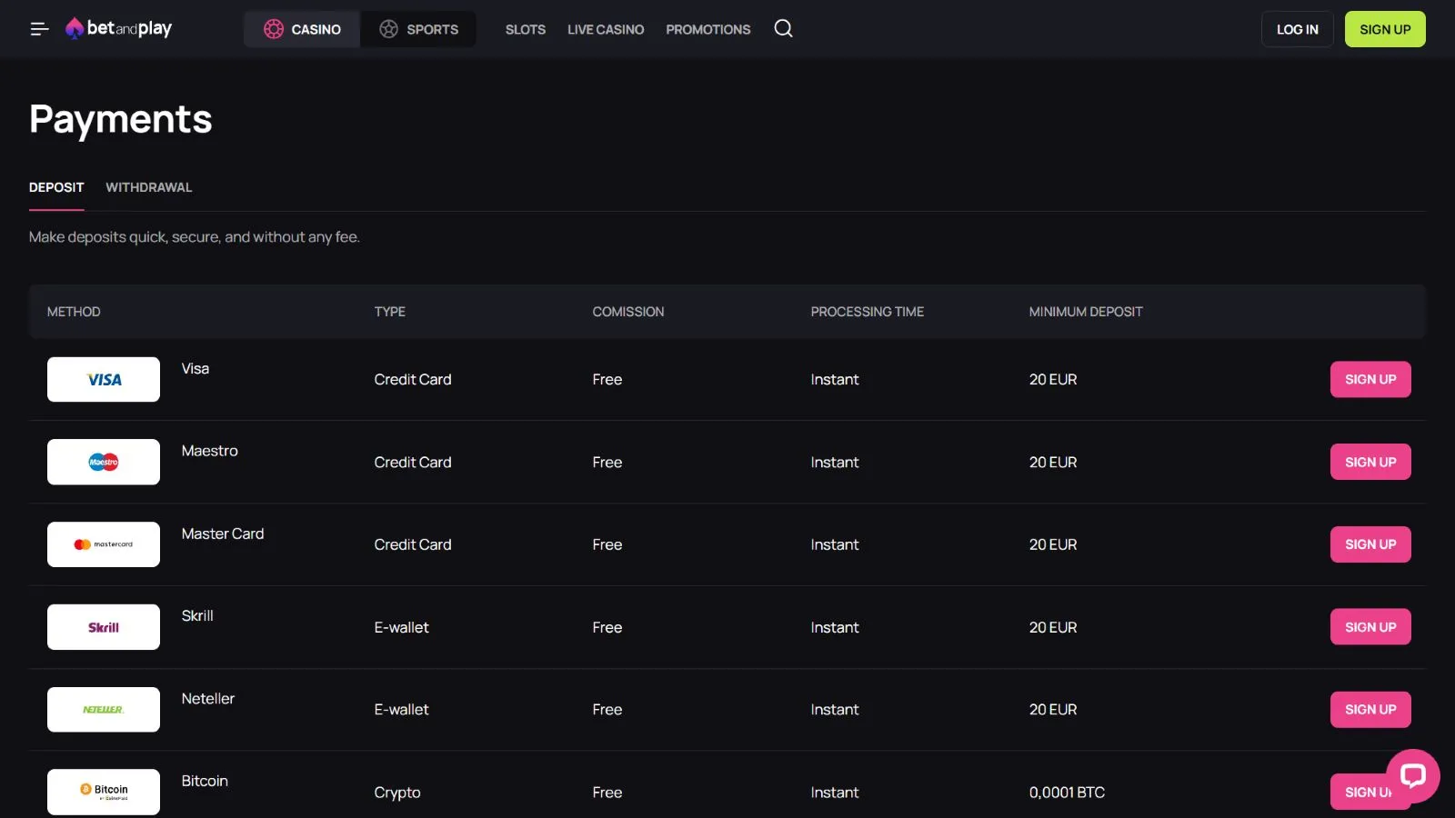 Payment Method | Min Deposit 20 - 4,000 EUR | Min Withdrawal 20 - 4,000 EUR |