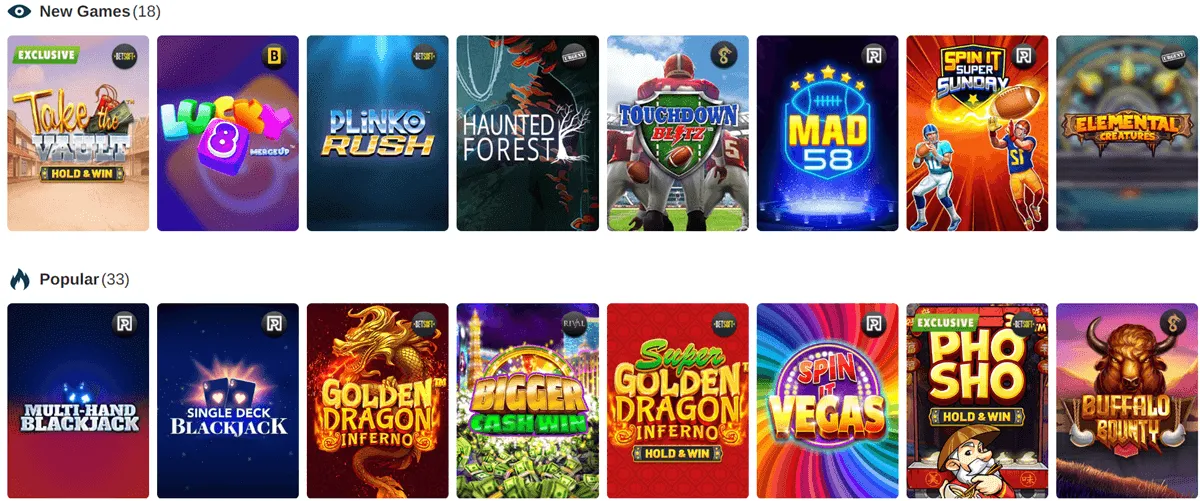Then, if you continue scrolling, you will see a few games for each of these categories. Also, you will find some other casino promotions such as 20% Monthly Reload, 10% Weekly Casino Rebate, Turbo Tuesday, and Casino Cash Races.