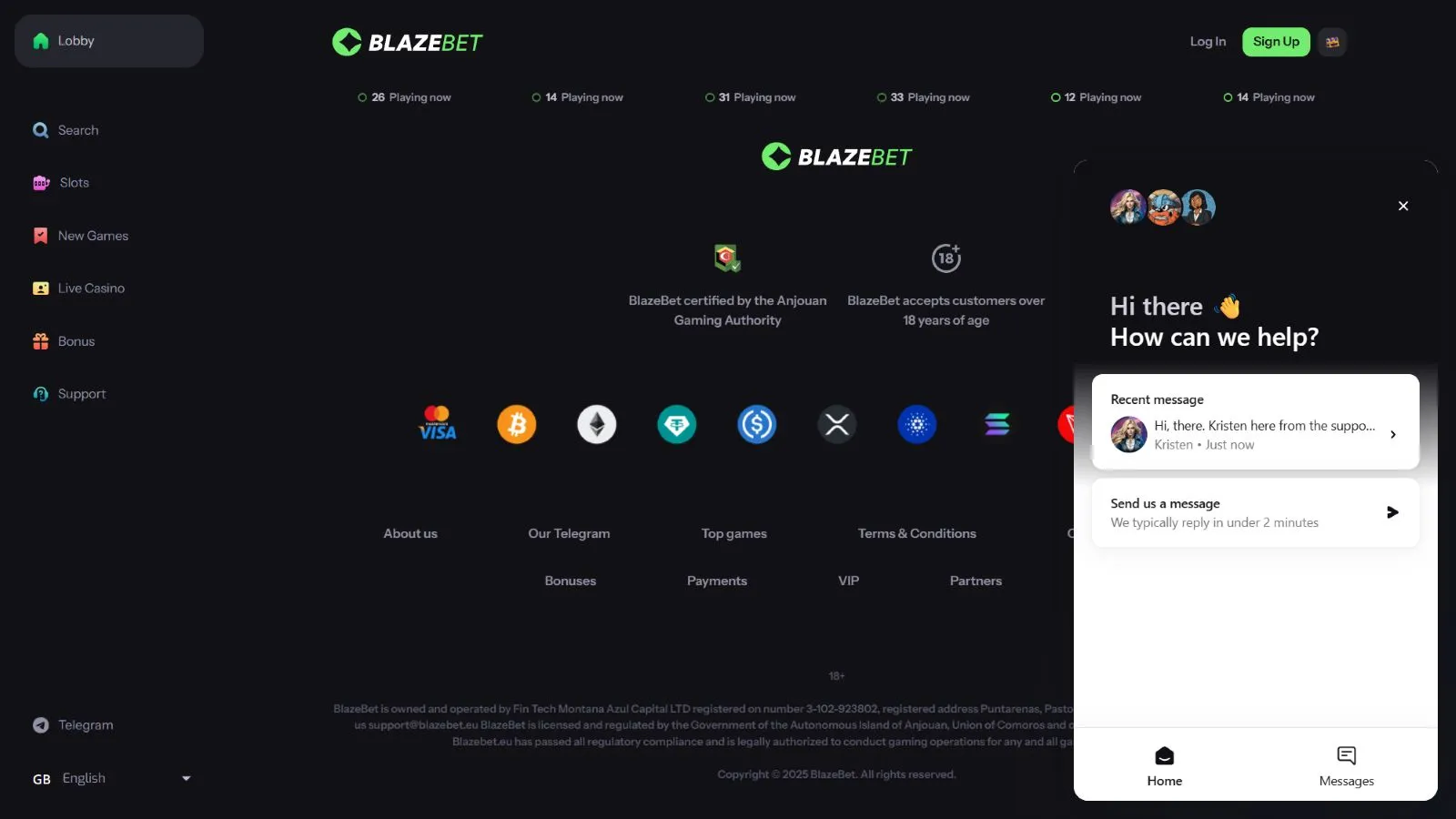 Owned by Fin Tech Montana Azul Capital LTD, BlazeBet is licensed and regulated by the government of the Autonomous Island of Anjouan. It uses HTTPS encryption to process financial transactions and store users’ data securely on its site.