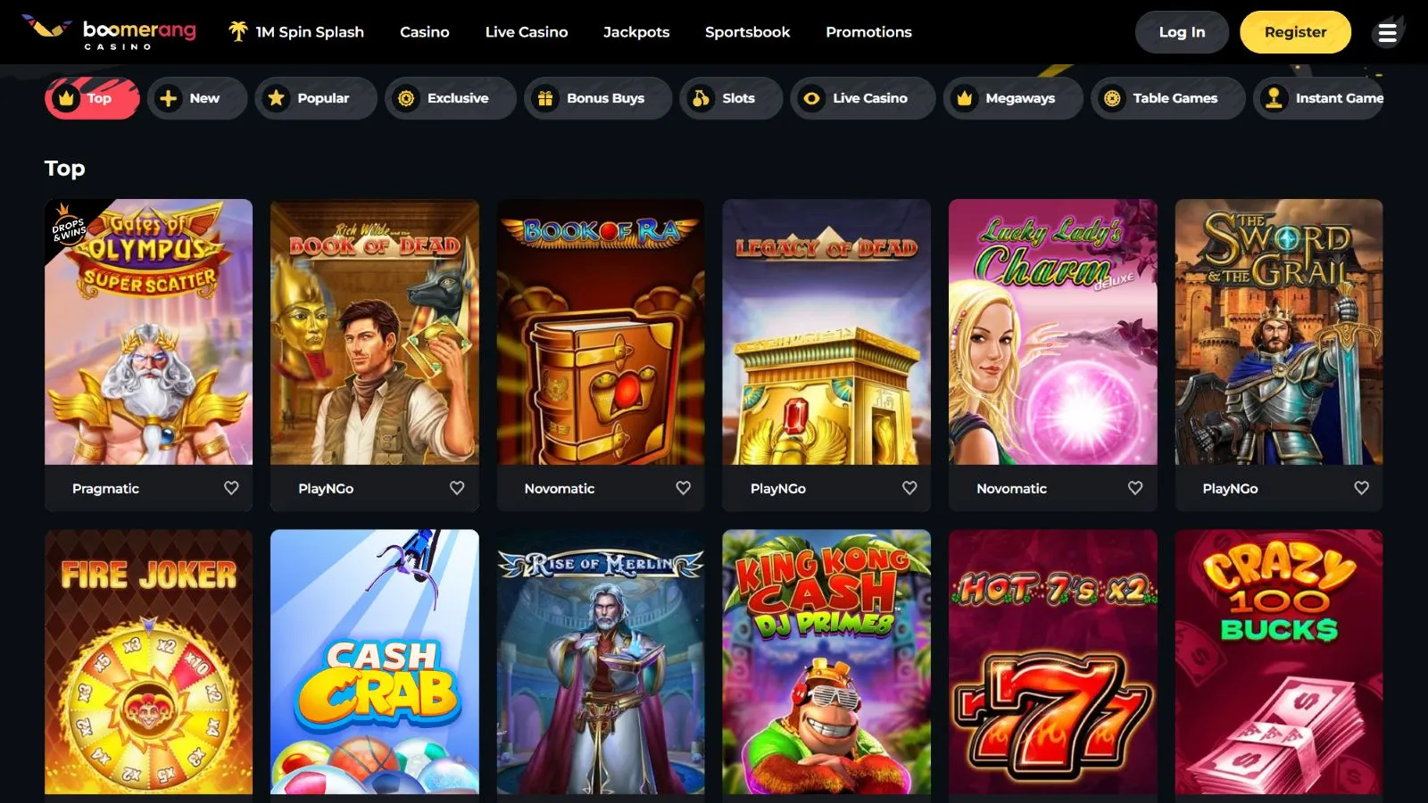 When you like to play some slots, just log in to your Boomerang account and click on the “Slots” button from the games lobby. Then, you will see the best slots from all of the gaming providers. Each of these slots is having a great-looking featured image and below the image, you can find the name of the game provider. Also, there can be additional info such as New, Top, Popular, etc.