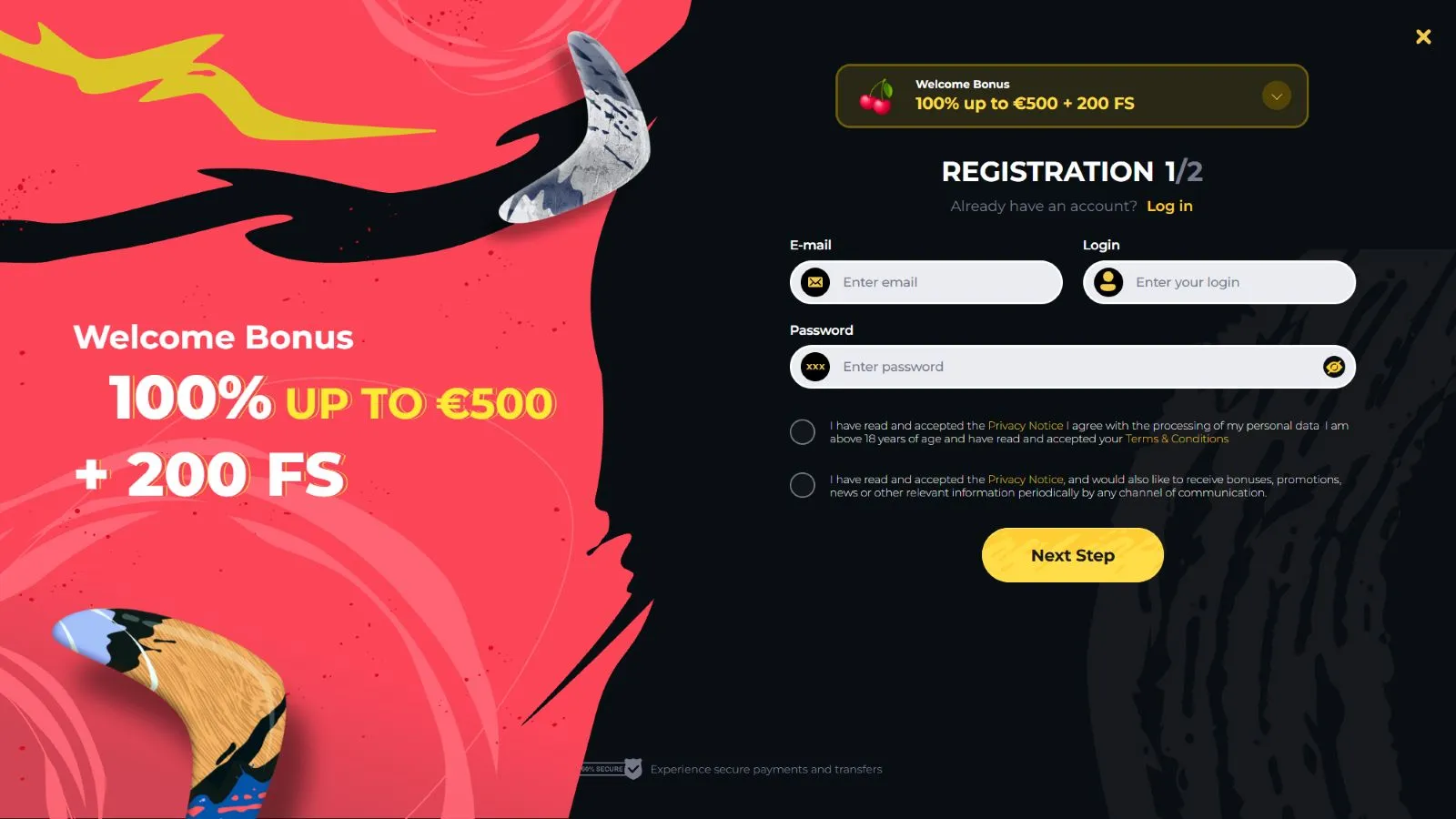 By clicking on the Sign-Up button you will get to the registration form. Just complete this form and you will have an open account at Boomerang casino and you will be ready for your first deposit bonus of up to €500 + 200 Free Spins.