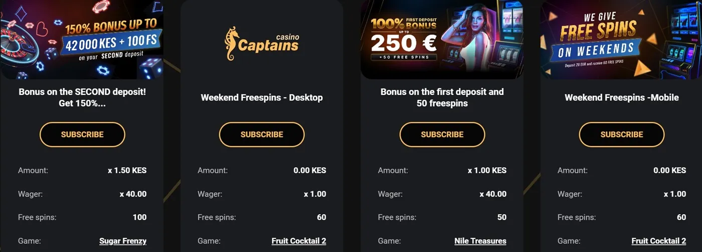 Captains.bet made a separate bonus for every fan of Live Casino games. For a deposit of $5 or more, you will be entitled to a 100% matching deposit bonus of up to $250. To get this bonus, you will also have to click on the “Subscribe” button under the corresponding bonus.