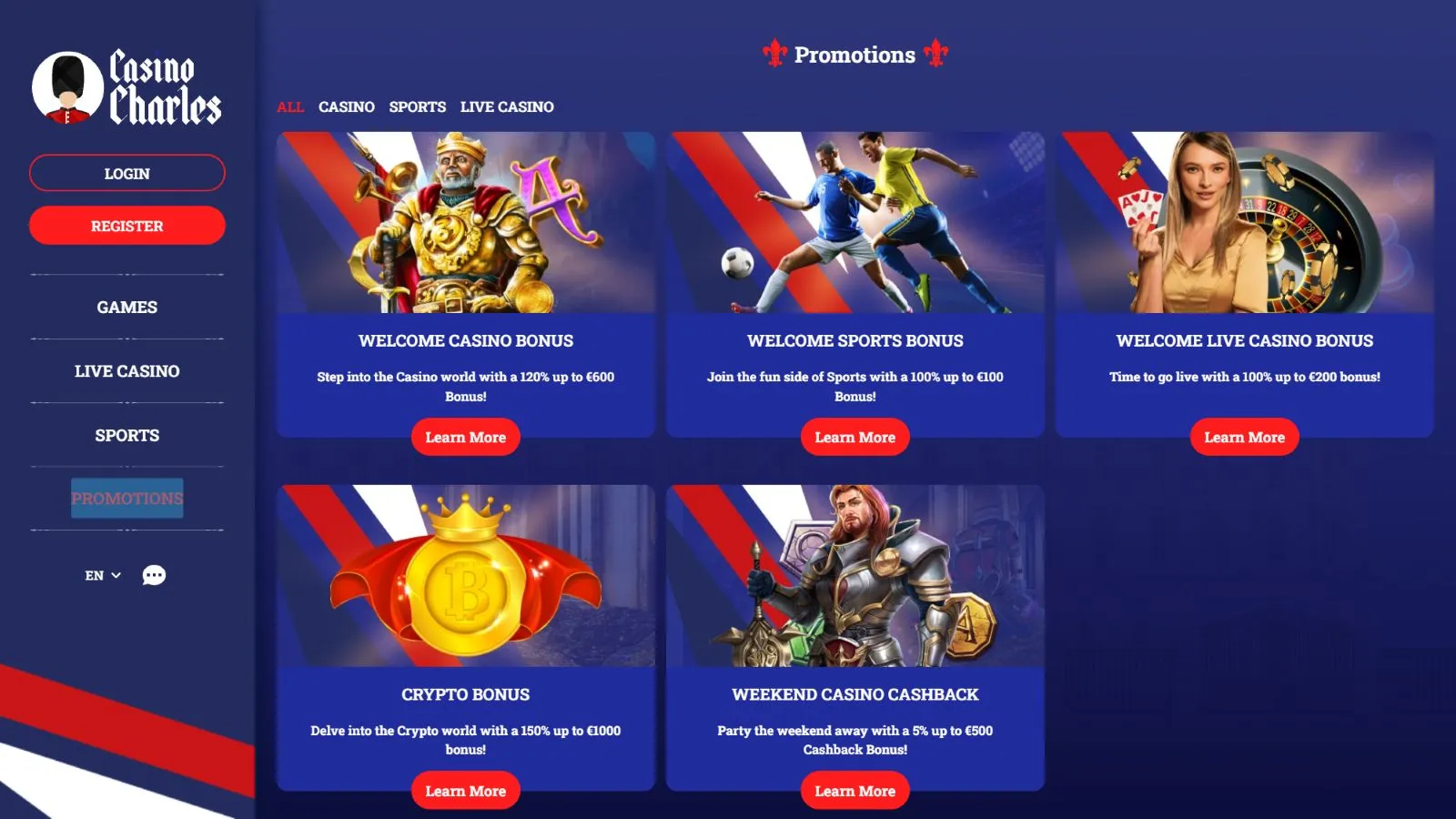 Launched in 2024, Casino Charles offers a vast collection of game titles, competitive sports betting markets, and fast cashouts. This crypto casino is a multilingual platform that offers four languages, specifically English, German, Finnish, and Norwegian.