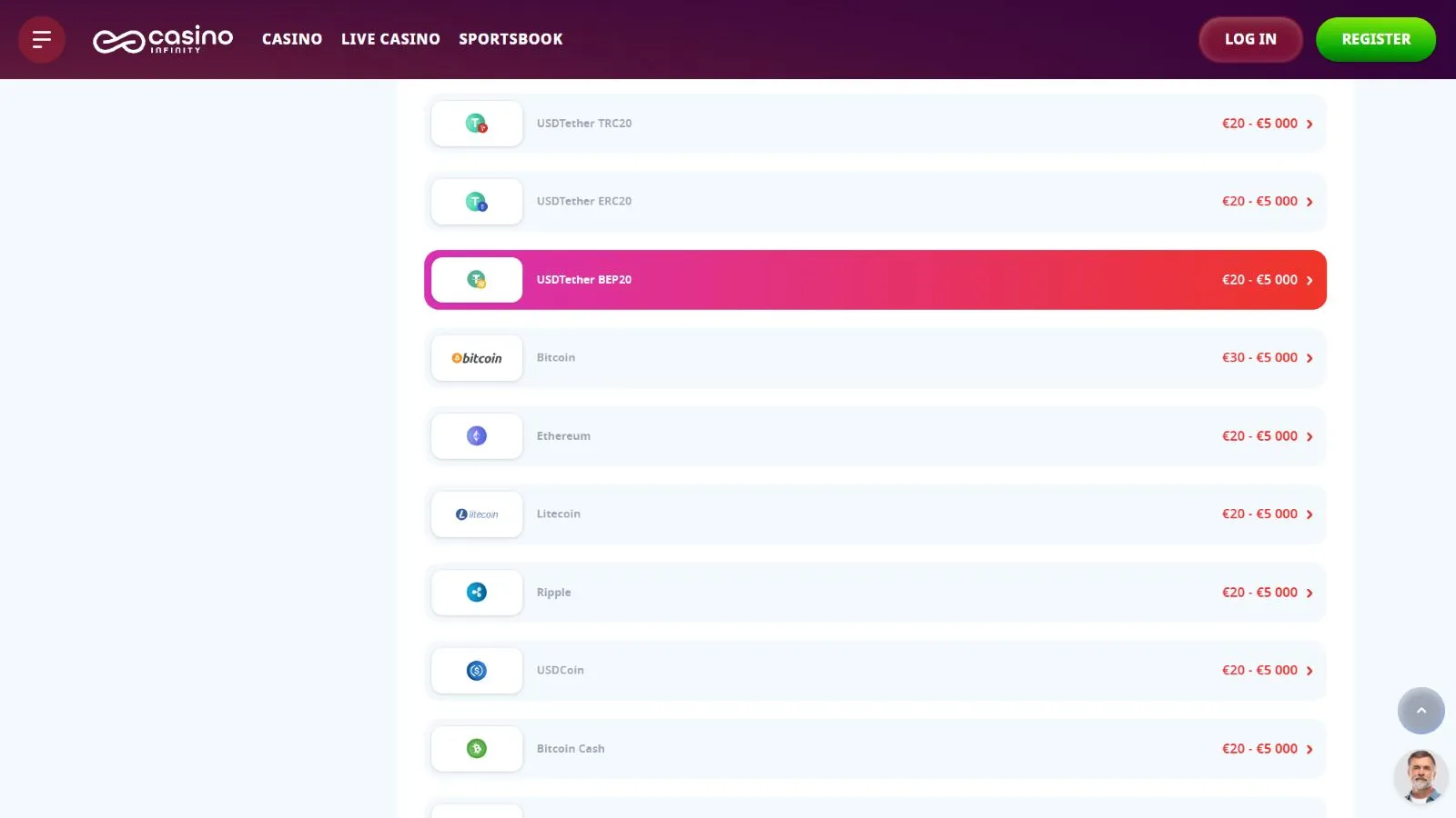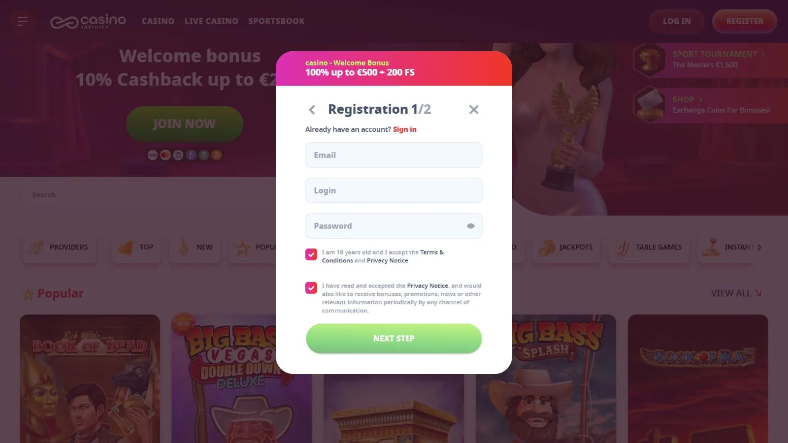 The only way to start playing at Casino Infinity is by owning a personal account. You can do that by completing the registration procedure, which starts by clicking on the “Register” button in the top bar. Then, you will be able to select a bonus or even continue without a bonus. In the next steps, you should provide your email address, username, country, phone number, and personal details. When you are done with the form, you can continue by making a deposit and trying out your favorite games.